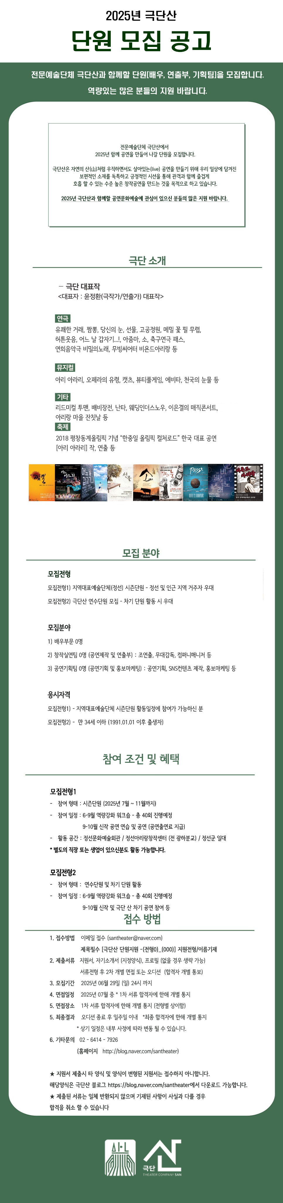 "전문예술단체 극단산에서 2025 정선 내에서 함께 공연 작업을 함께 할 시즌단원을 모집합니다!"