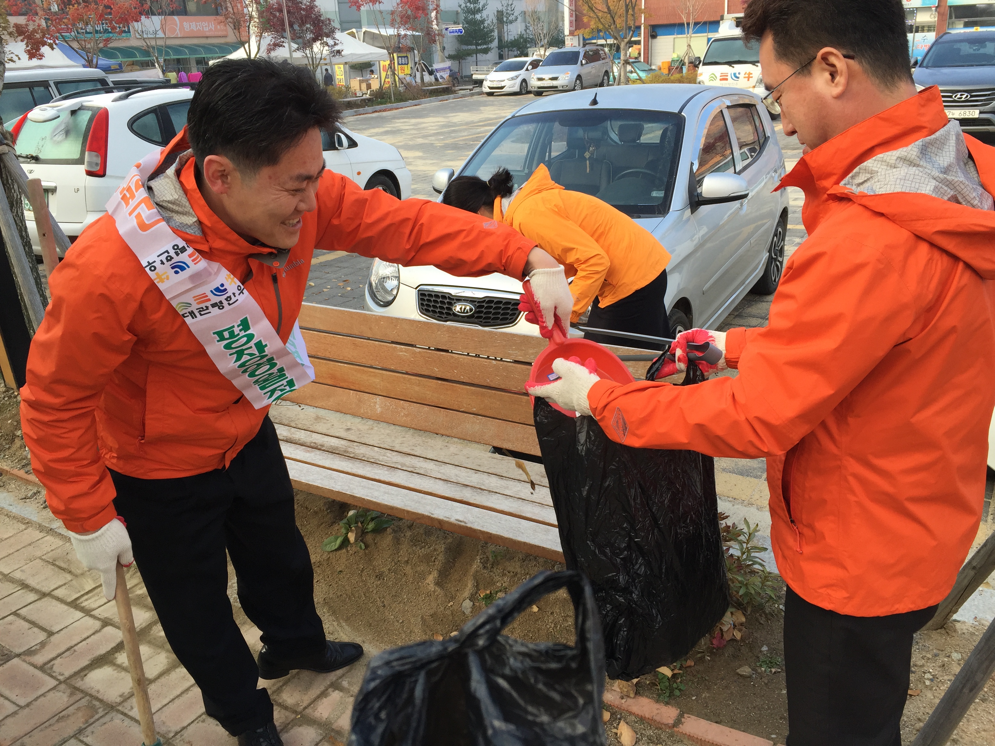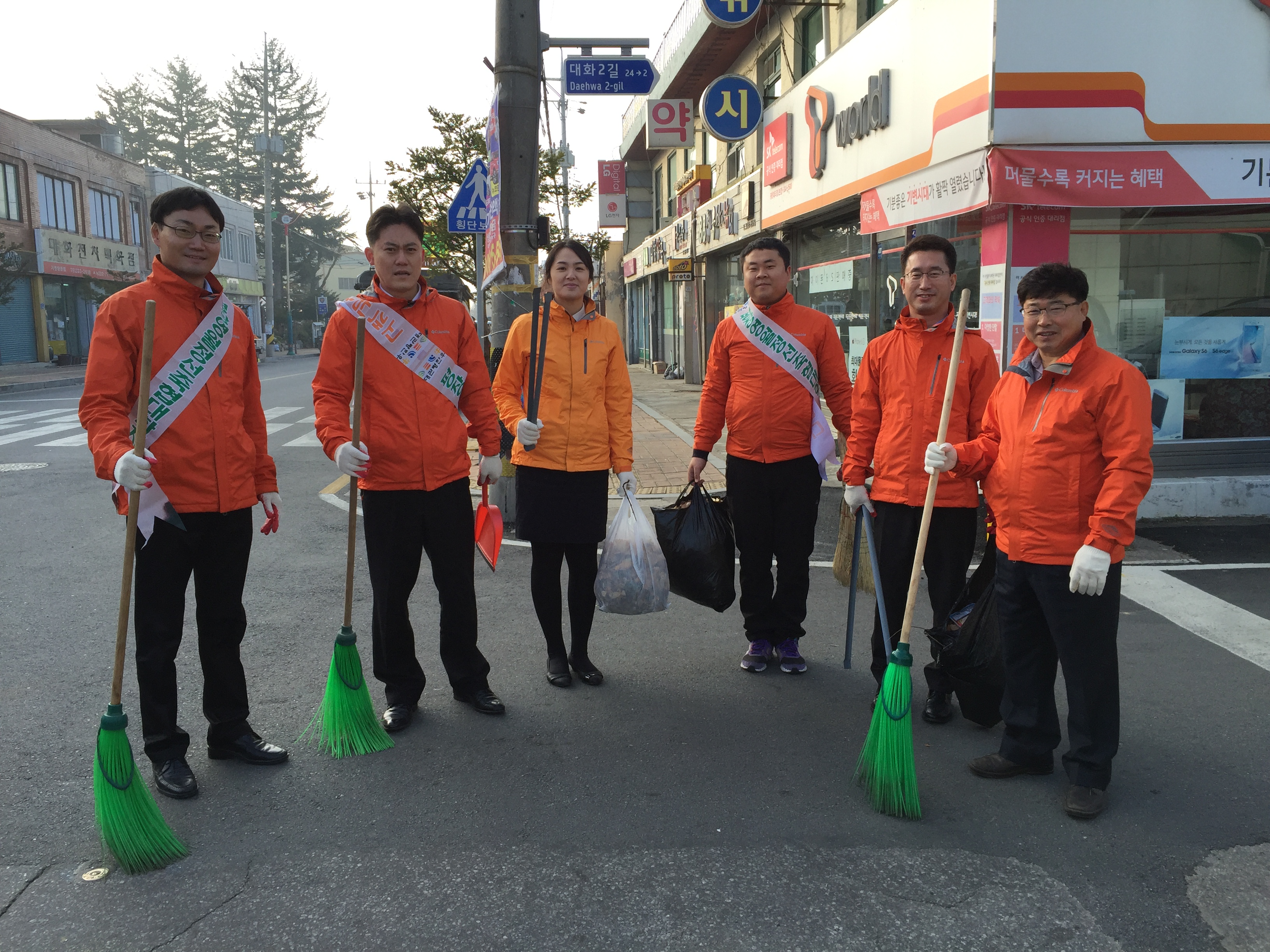 지난(11.4) 08:00 평창영월정선축산농협 대화지점(지점장 이석민)직원 9명은 굿-매너평창 문화시민운동 ‘청결의 날’을 맞아 대화시가지 청소담당구역(축협 주변)에서 환경정화활동을 실시.
