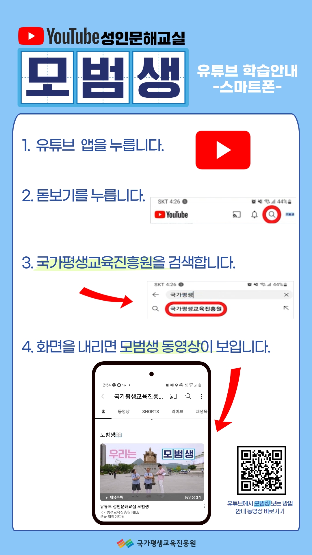 교육부와 국가평생교육진흥원이 기초생활문해능력 함양을 위해 유튜브 성인문해교실 '모범생' 프로그램을 제작하였습니다. 문해교육 수업에 활용하시기 바랍니다.