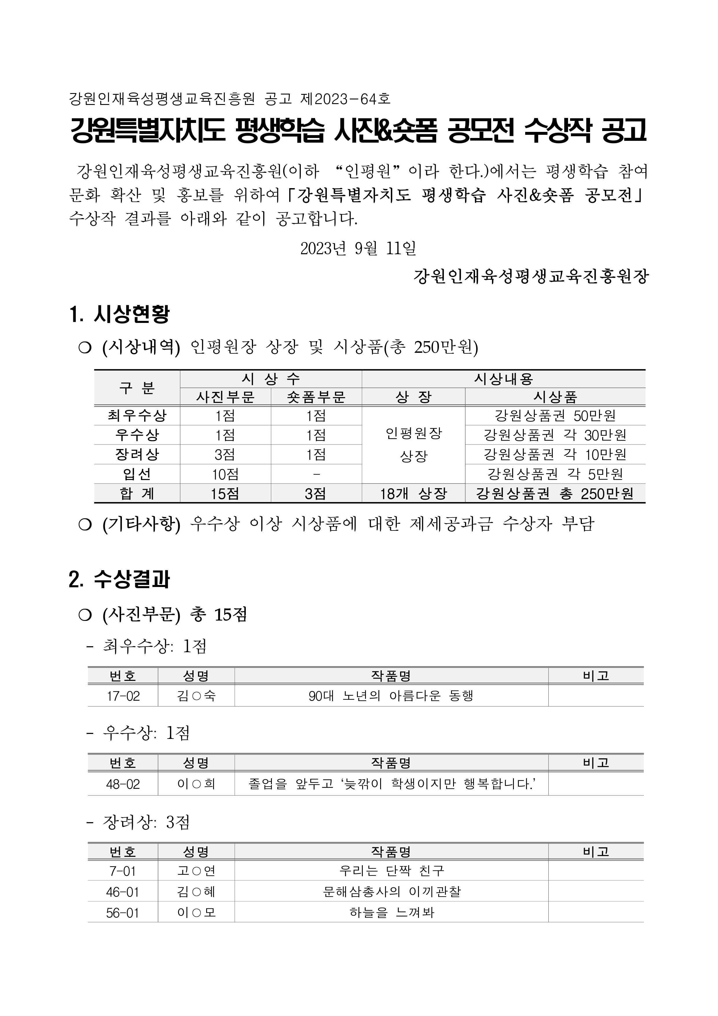 강원인재육성평생교육진흥원 공고 제2023-64호