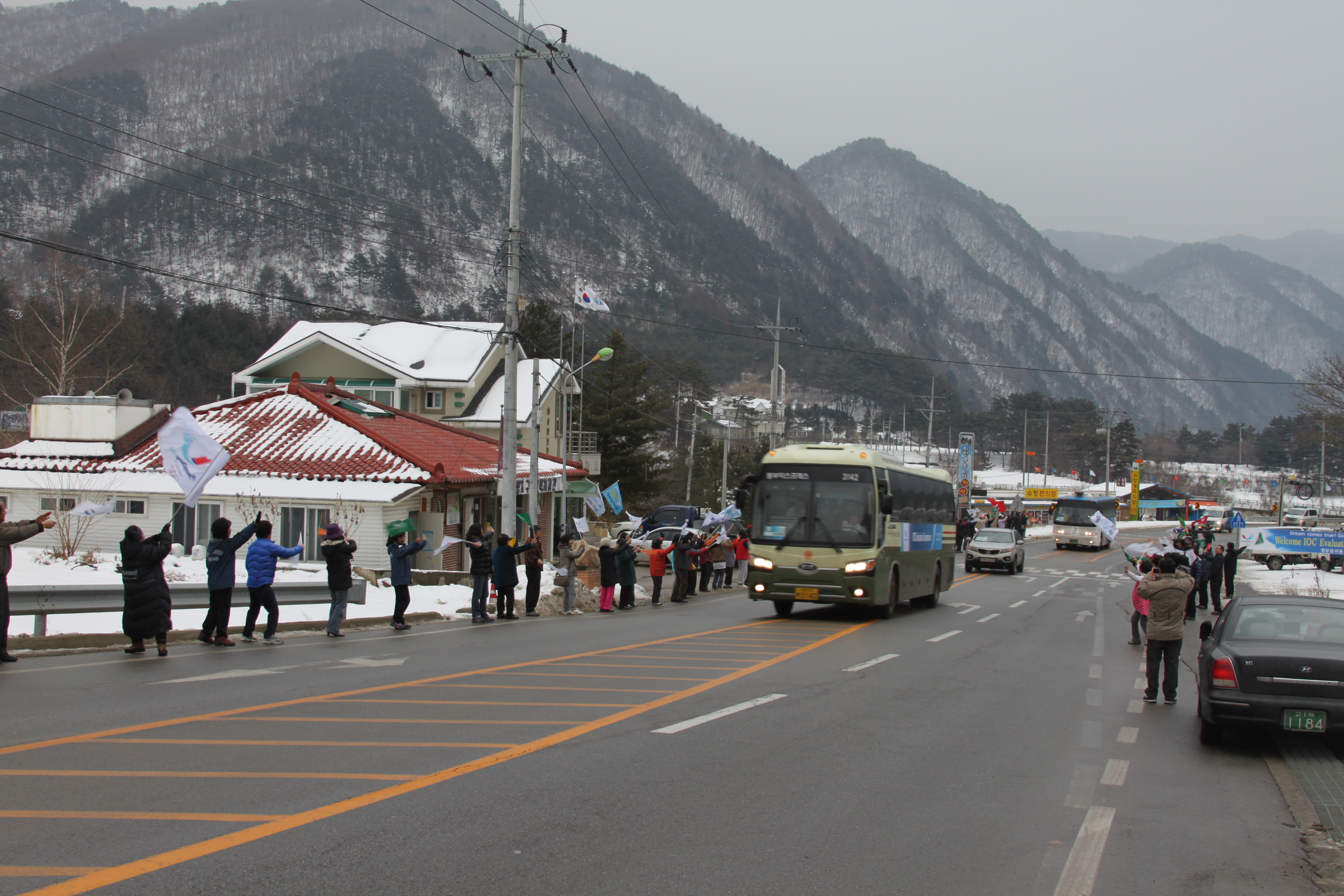 작은 산간마을인 수항,화의리 주민 100여명이 실사단을 열렬히 환영하는 모습입니다.