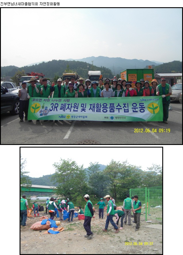 6월 4일 진부면남녀새마을협의회 회원 70여명이 상진부1리, 송정2리, 수항리 , 하진부1리 체육공원 일대에서 페비닐 수거 및 자연정화 활동을 펼쳤다.