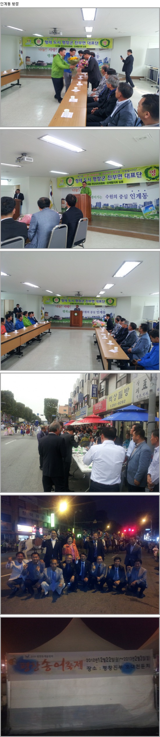10월 5일 진부면 대표단 20여명은 수원시 팔달구 인계동을 방문했다. 2009년 12월 인계동과 진부면이 자매결연을 맺은것이 인연이 되어 상호 꾸준한 왕래를 해 오고 있다.마침 10월 5일부터 세계적인 축제인 수원화성문화제 개막식이 있었다. 인계동 주민자치위원장, 동장 등 주민들의 환송에 깊은 감사를 드리고 앞으로도 상호 꾸준한 왕래가 있었으면 한다. 그리고 축제 3일 기간동안 평창송어축제에서 적극 홍보를 나서고 있다.