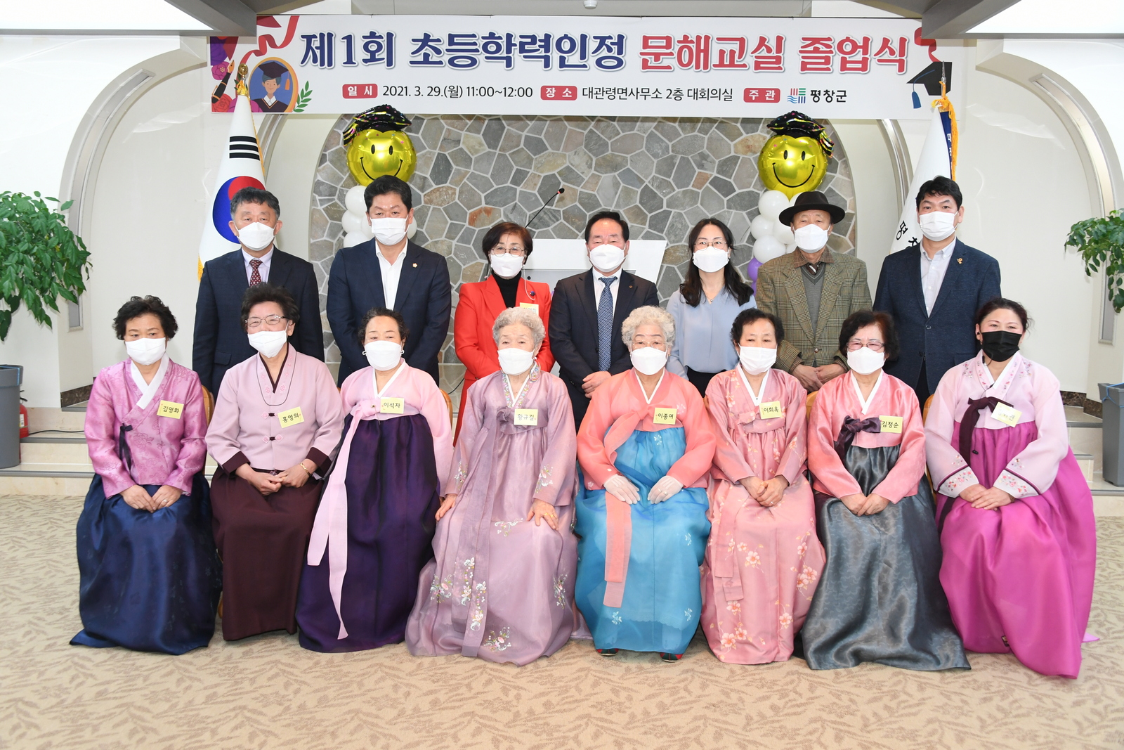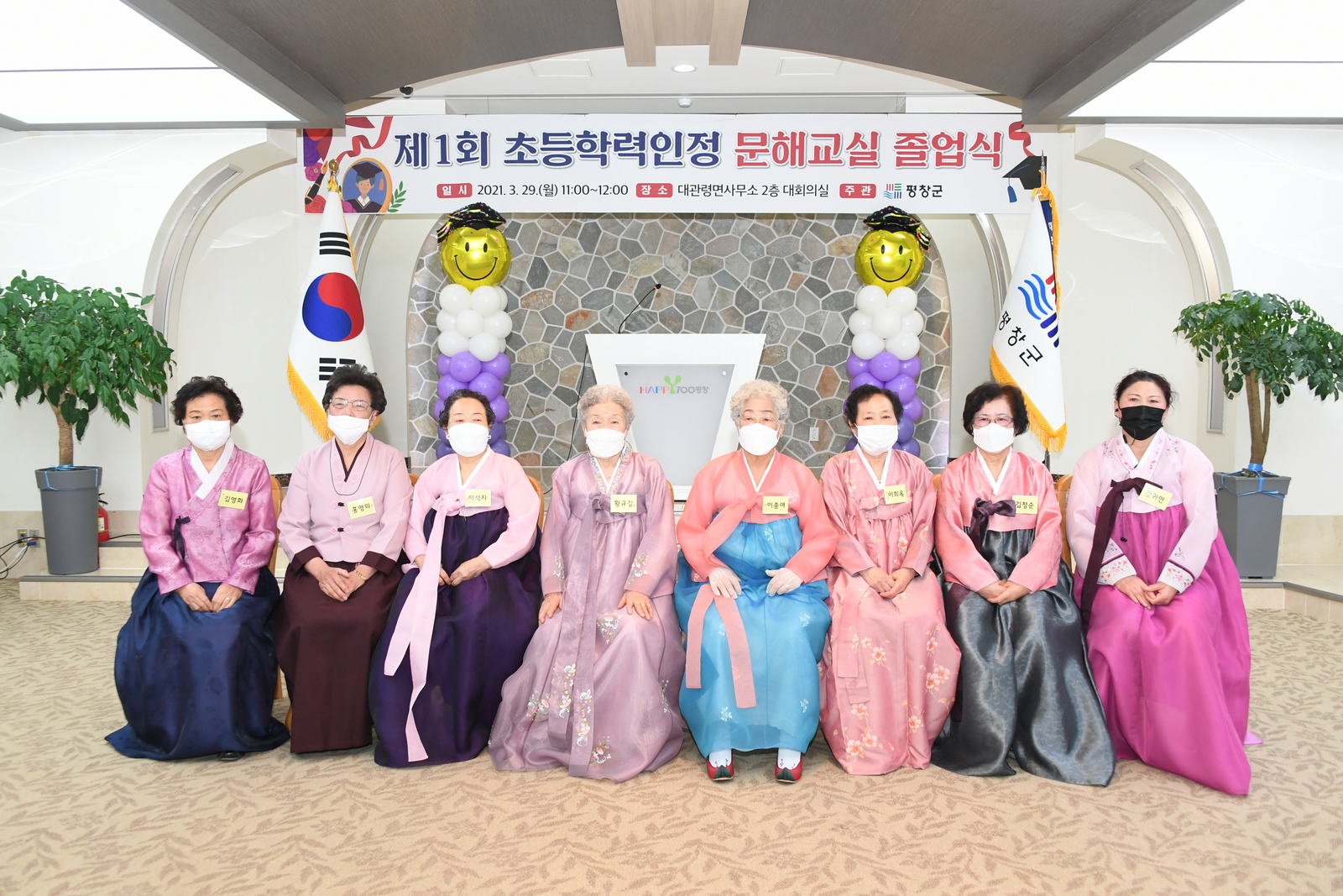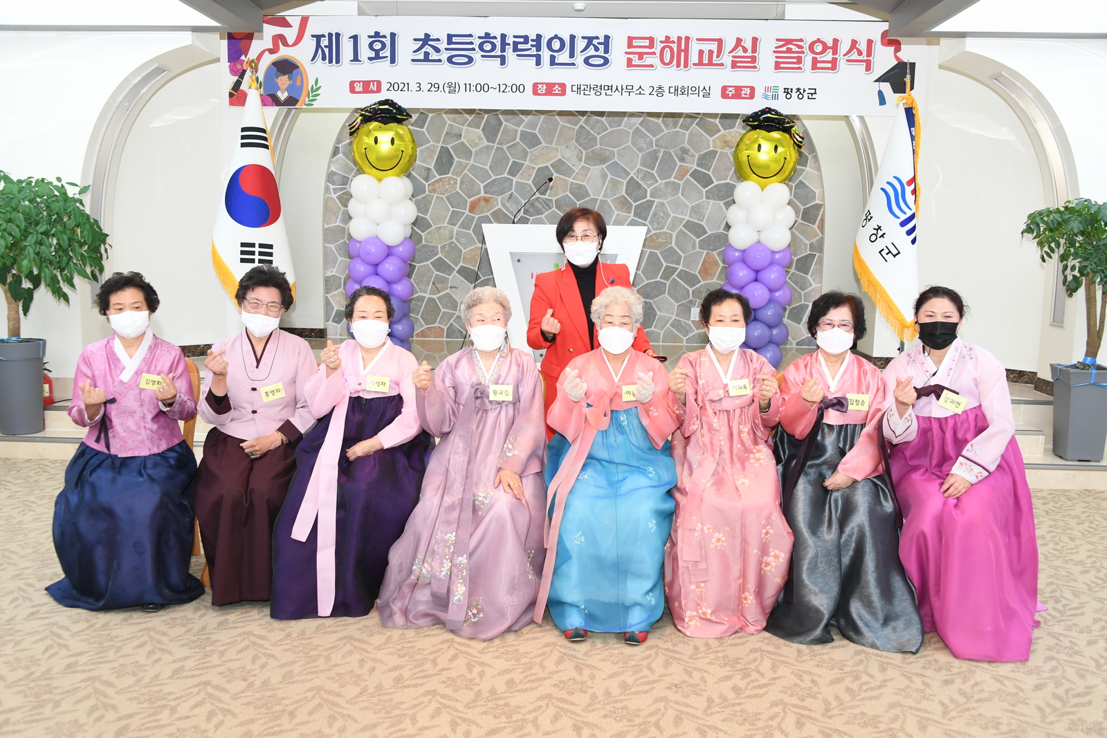 제1회 초등학력인정 문해교실(대관령도서관 인정반) 졸업식 사진입니다.