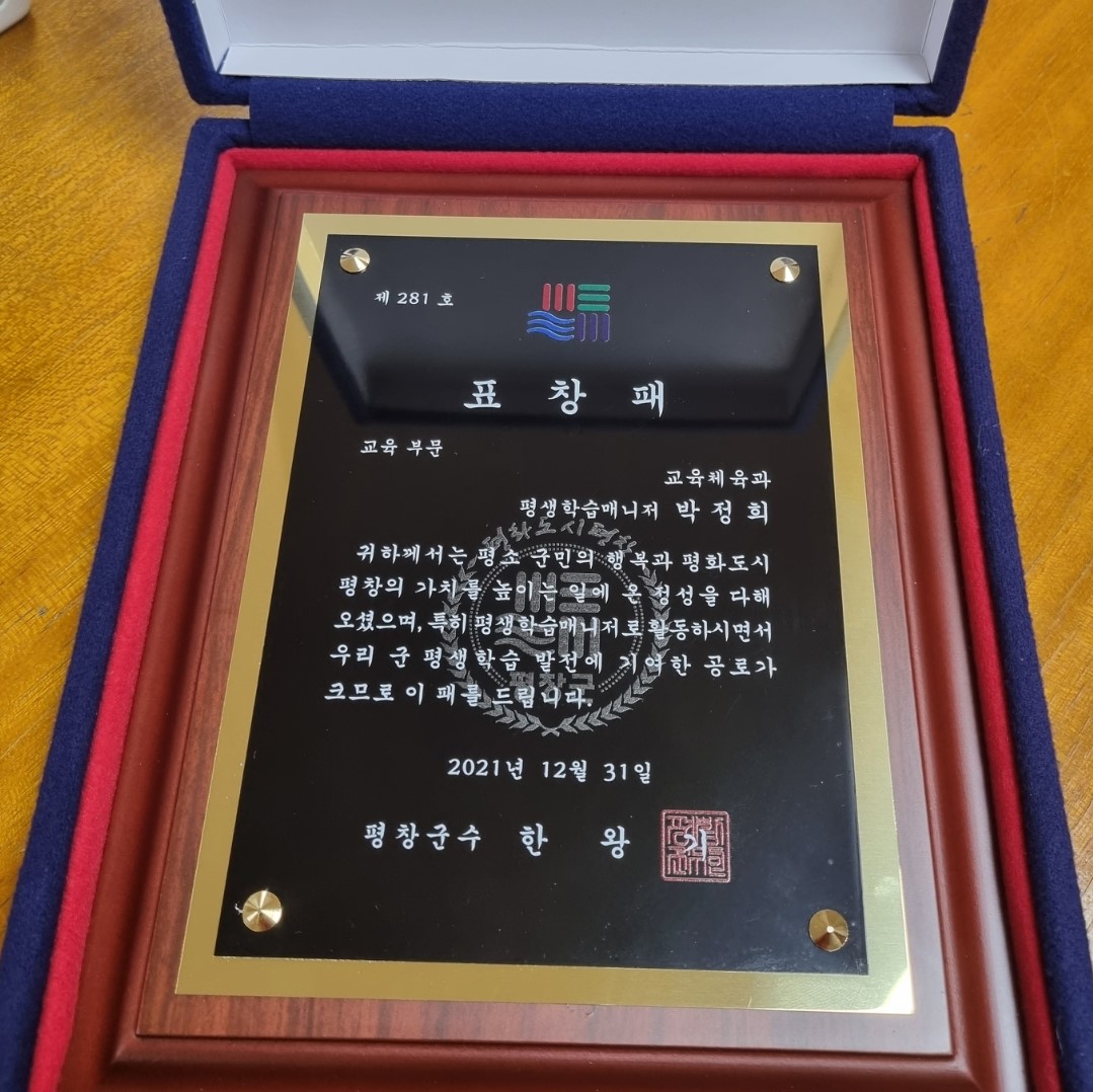 * 봉평면평생학습센터 매니저님의 군수님 평생학습 공로 표창 시상을 축하드립니다.