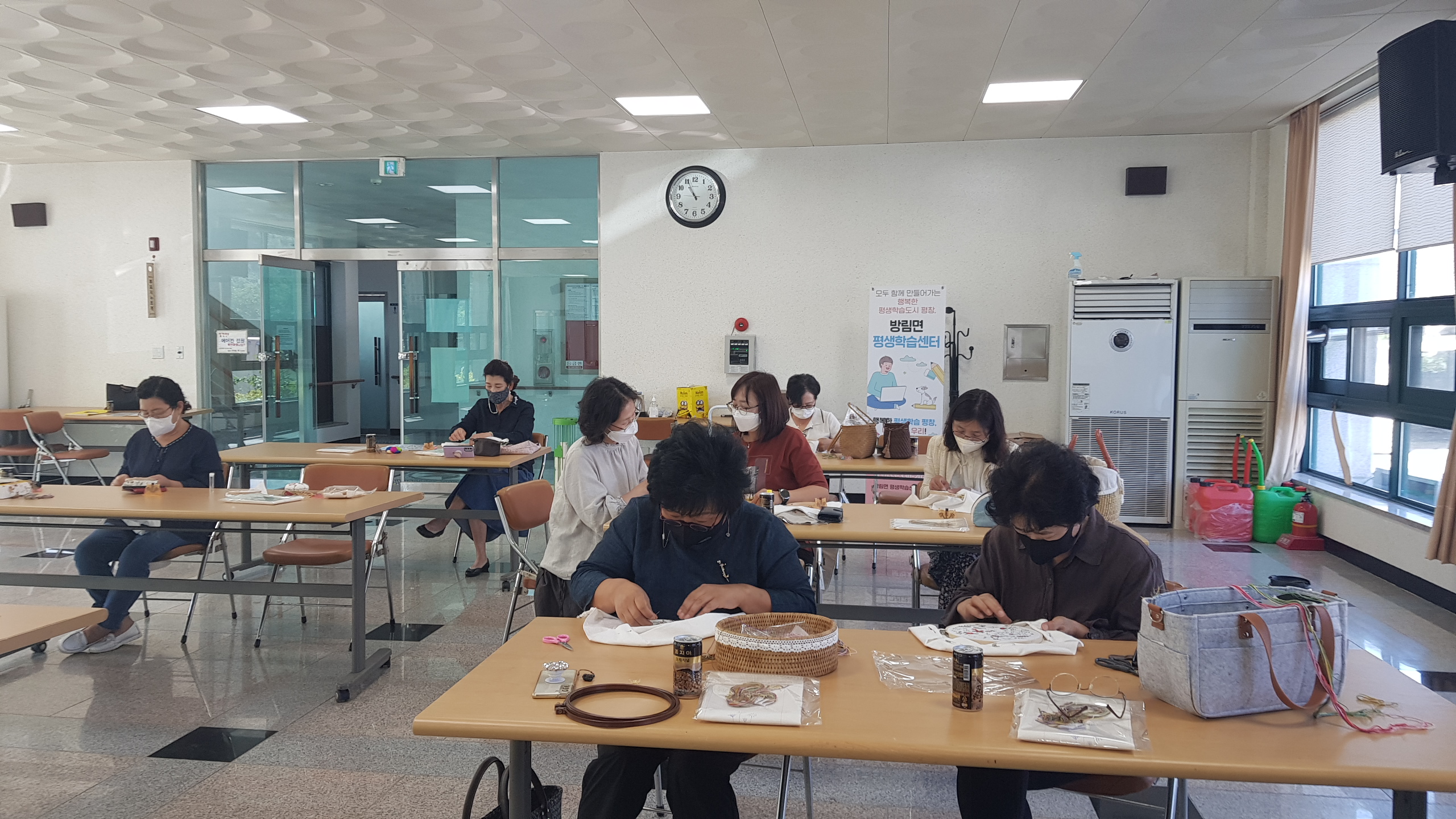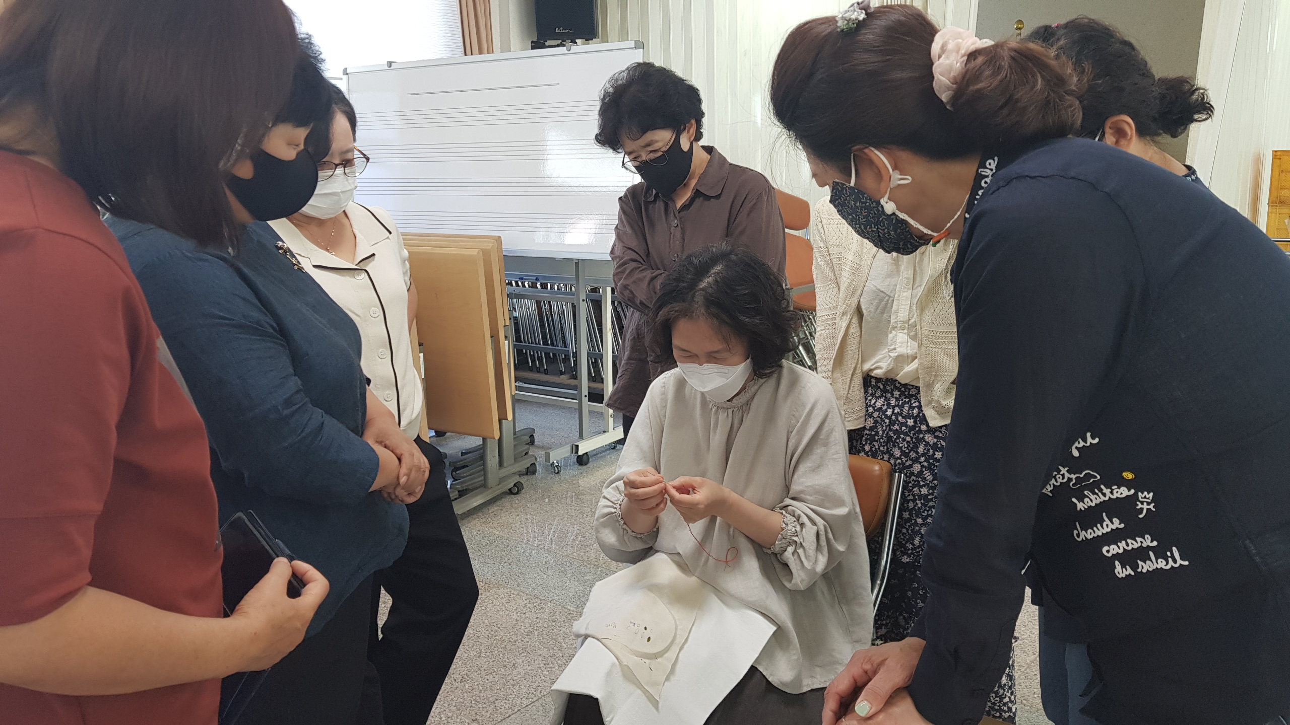 * 하얀 천위에 다양한 꽃과 줄기 등 자수 놓았어요.