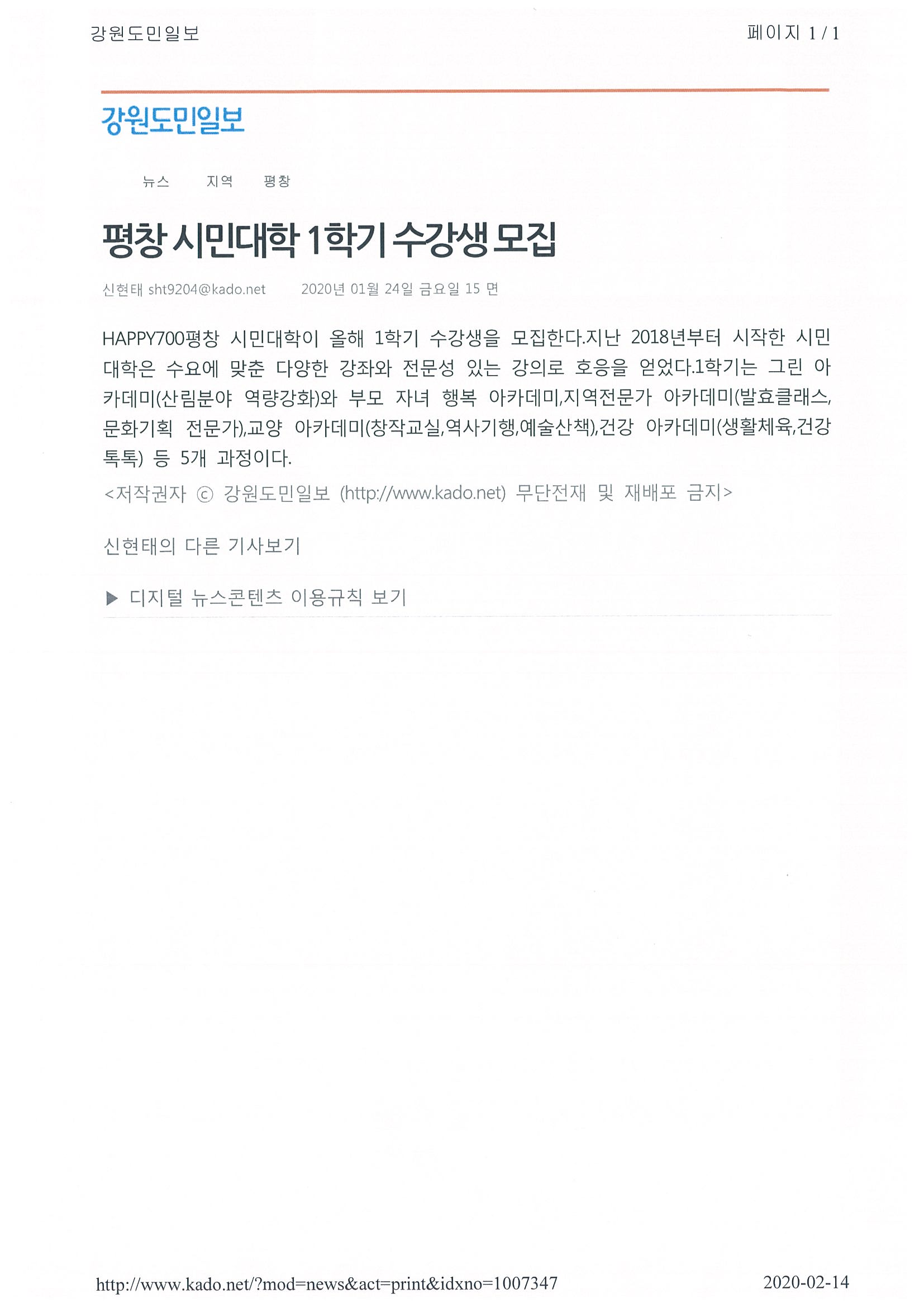 시민대학 보도자료(강원도민일보 2020. 1. 24.)
