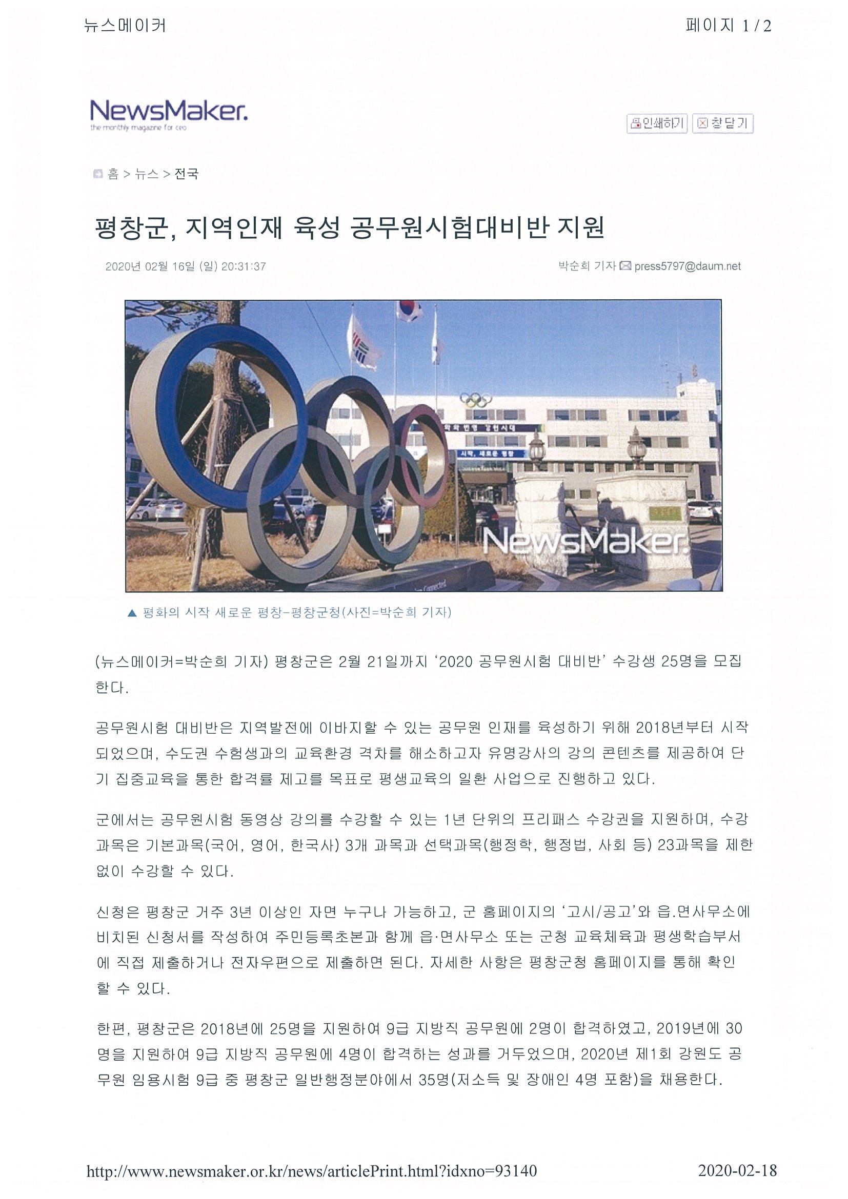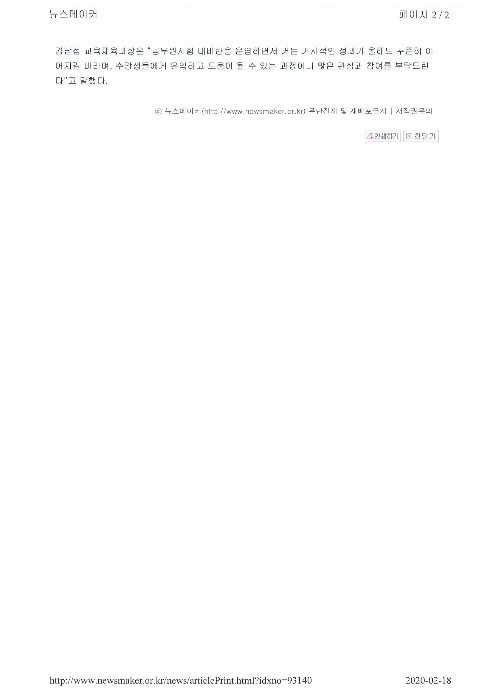 공무원시험 대비반 운영 보도자료(뉴스메이커 2020. 2. 16.)