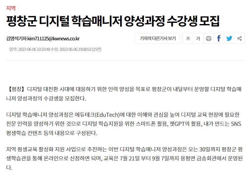 [2023. 6. 6. (화) 보도자료 강원일보 외] 평창군 디지털 학습매니저 양성과정 수강생 모집