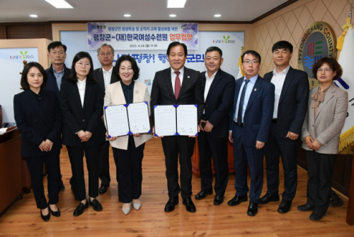 평창군은 24일 군수 집무실에서 심재국 평창군수, 고창영 한국여성수련원장을 비롯한 관계자들이 참석한 가운데 한국여성수련원과 평창군민 평생학습 및 공직자 교육에 관한 업무협약을 체결했다.