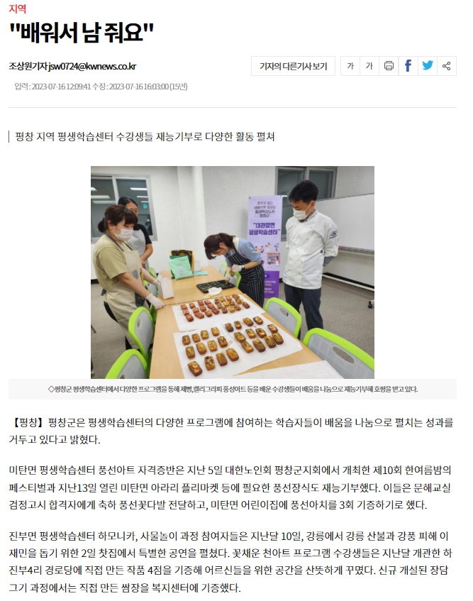 [2023. 7. 16.(일) 강원일보] "배워서 남줘요" 평창 지역 평생학습센터 수강생들 재능기부로 다양한 활동 펼쳐