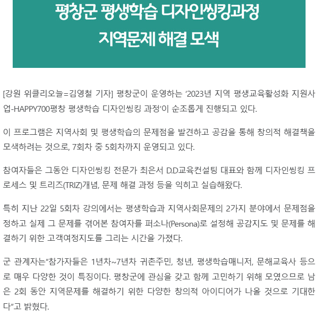 [2023. 7. 26.(수) 위클리오늘] 평창군, 평생학습 디자인씽킹 과정 지역문제 해결 모색