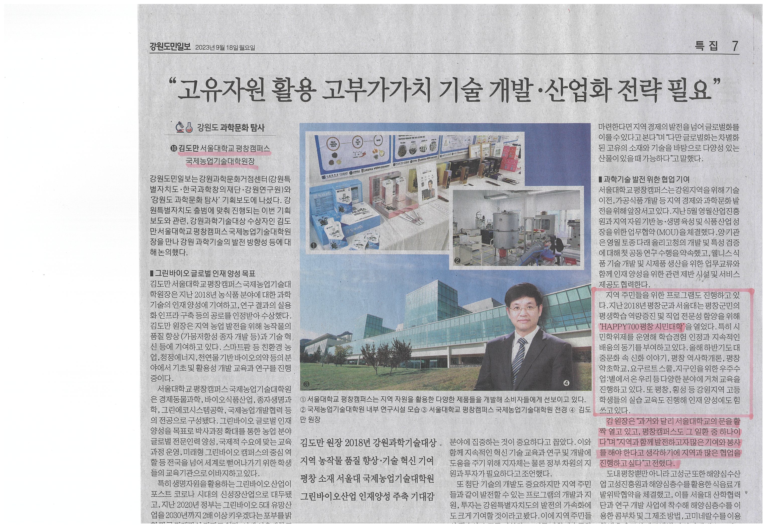 [2023. 9. 18.(월) 강원도민일보-지면] 김도만 서울대학교 평창캠퍼스 국제농업기술대학원장(HAPPY700평창 시민대학)
