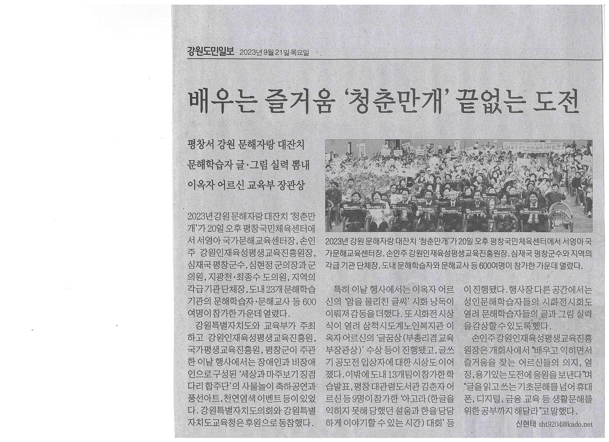 [2023. 9. 21.(목) 강원도민일보-지면] 배우는 즐거움 "청춘만개" 끝없는 도전 - 2023. 9. 20.(수) 강원 문해 자랑 대잔치 '청춘만개' 개최 관련