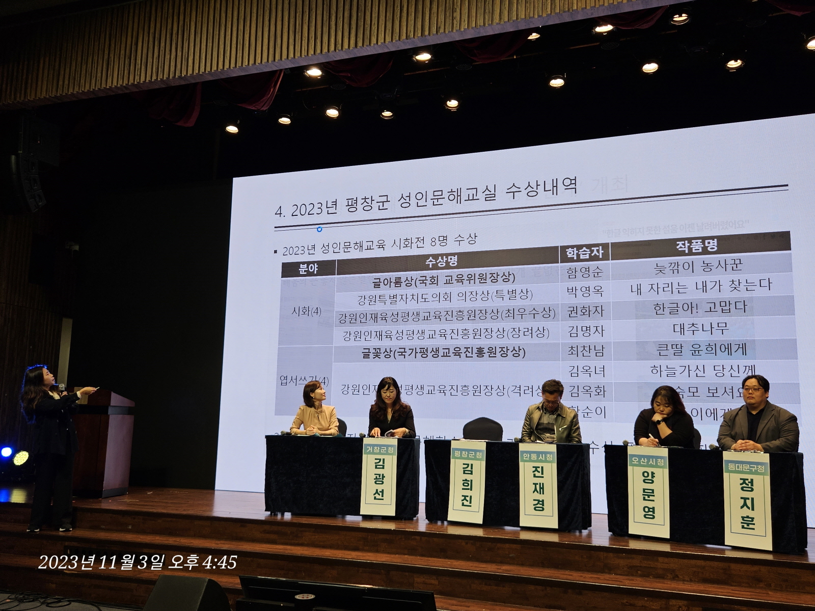 국가평생교육진흥원이 주관하는‘2023년 성인문해교육 성과 공유회’에 참가한 평창군은 ‘문해, 지역을 다채롭게 물들이다’는 주제로 군에서 운영하고 있는 문해교실의 사례를 소개했다.