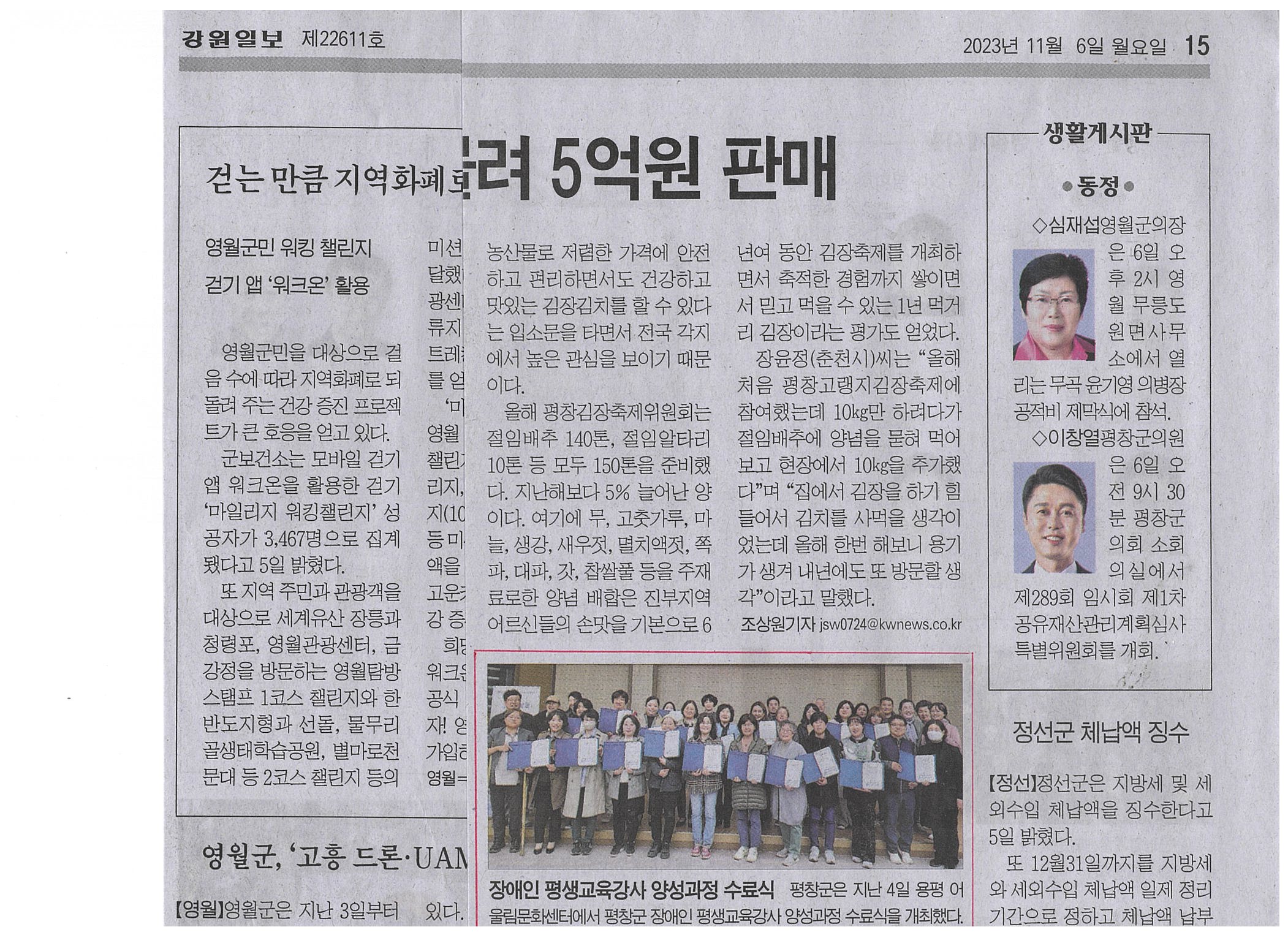[2023. 11. 6.(월) 강원일보-지면] 평창 장애인 평생교육강사 양성과정 수료식 - 수료식: 2023. 11. 4.(토) - 장 소: 용평 어울림문화센터
