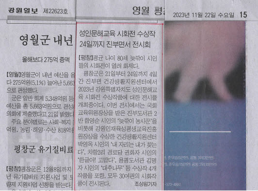 [2023. 11. 22.(수) 강원일보-지면] 성인문해교육 시화전 수상작, 24일까지 진부면서 전시회
