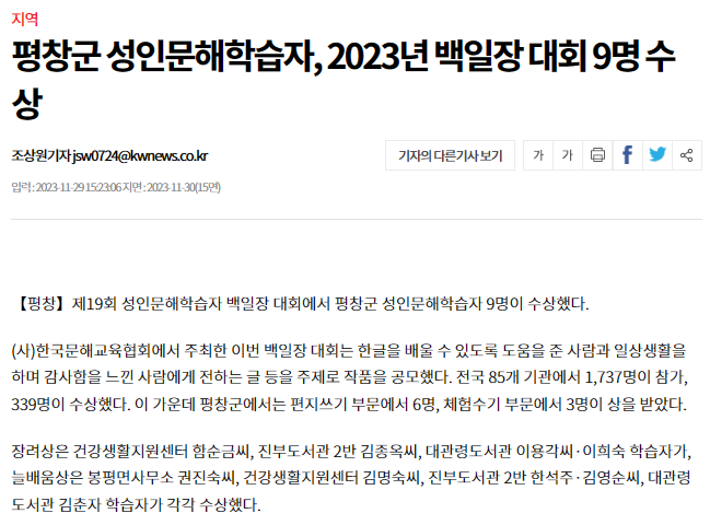 평창군 성인문해학습자, 2023년 백일장 대회 9명 수상