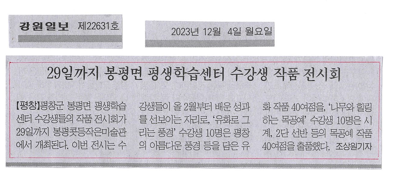 [2023. 12. 4.(월) 강원일보-지면] 29일까지 봉평면 평생학습센터 수강생 작품 전시회