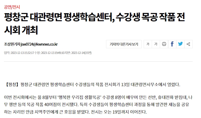 [2023. 12. 13.(수) 강원일보] 평창군 대관령면 평생학습센터, 수강생 목공 작품 전시회 개최
