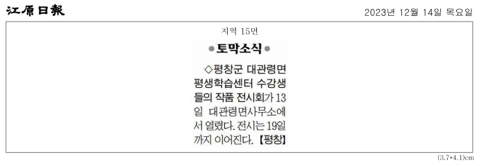 [2023. 12. 14.(목) 지면 / 강원일보] 평창군 대관령면 평생학습센터 수강생들의 작품 전시회