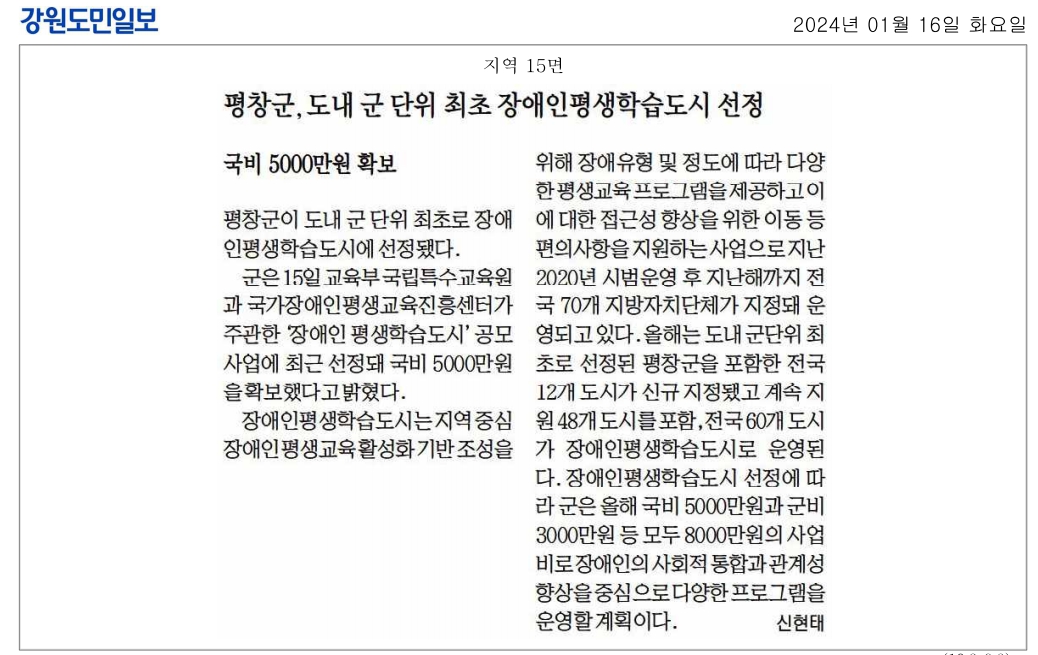 [2024. 1. 16.(화) 지면-강원도민일보] 평창군, 도내 군 단위 최초 장애인평생학습도시 선정