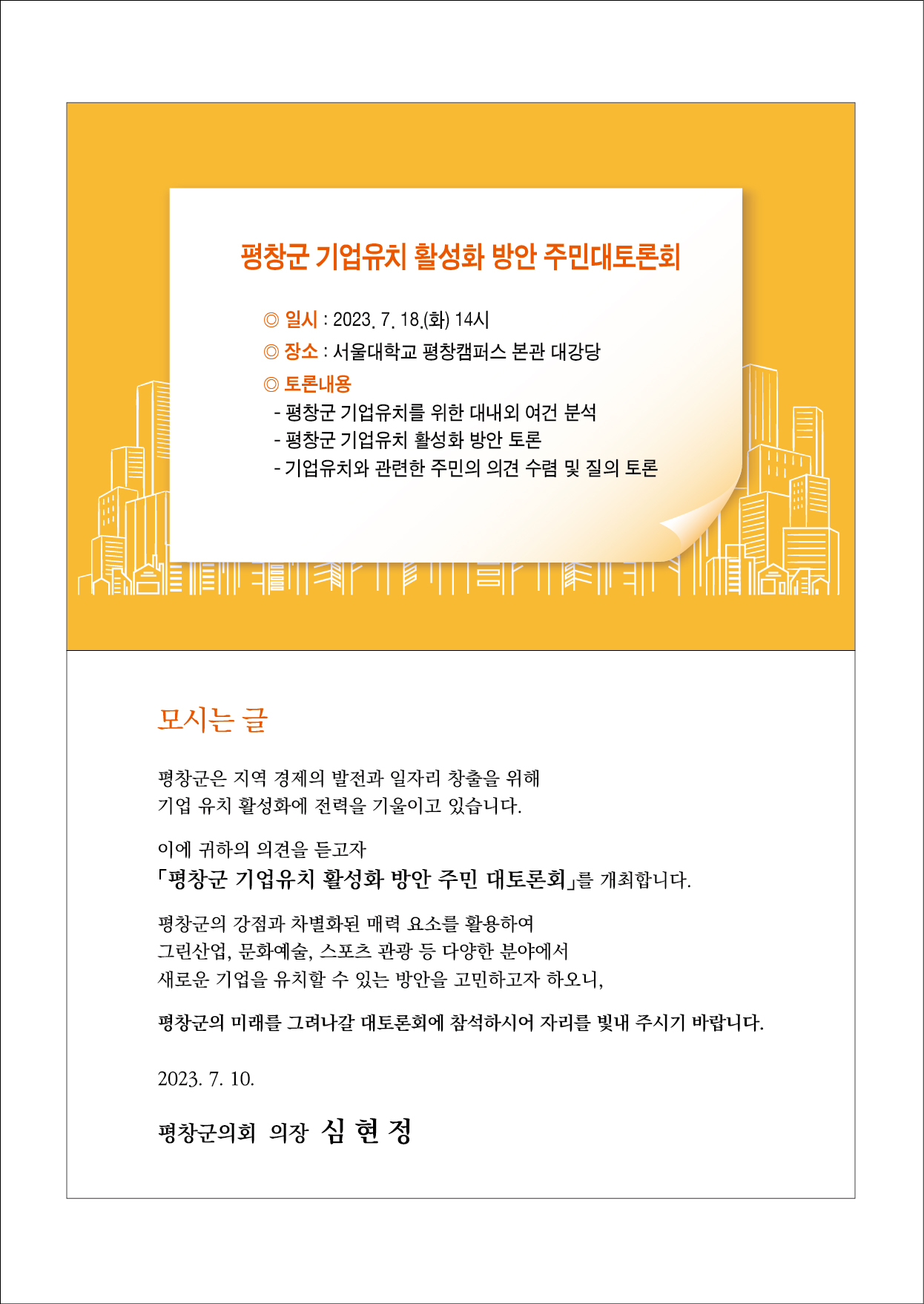 평창군 기업유치 활성화 방안 주민대토론회(7월 18일 14시)