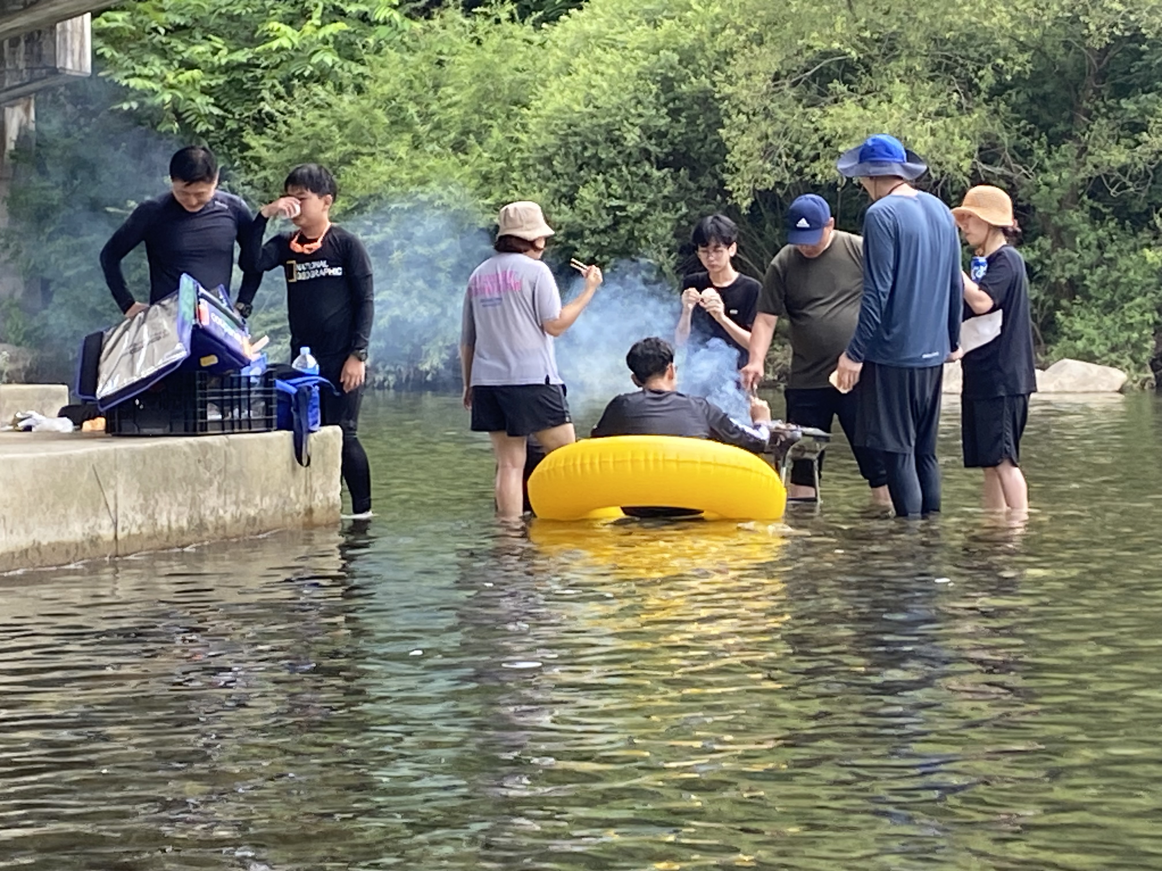 다들 물이놀 하는 곳에서 물속애 들오가서 바베큐 파티를 온가족이 하고있네요