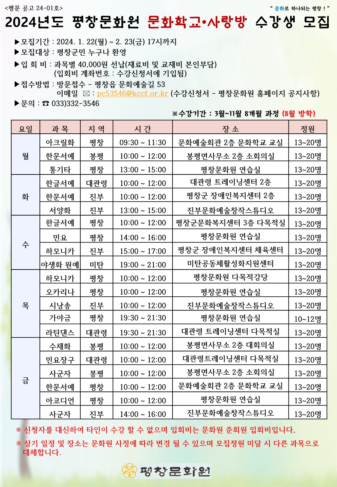 평창문화원에서는 2024년도를 함께할 문화학교 사랑방 수강생을 모집하오니