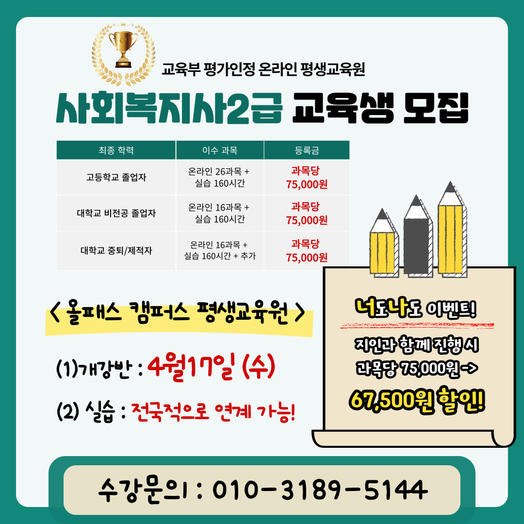 사회복지사2급, 1년과정 교육 50% 장학생 모집