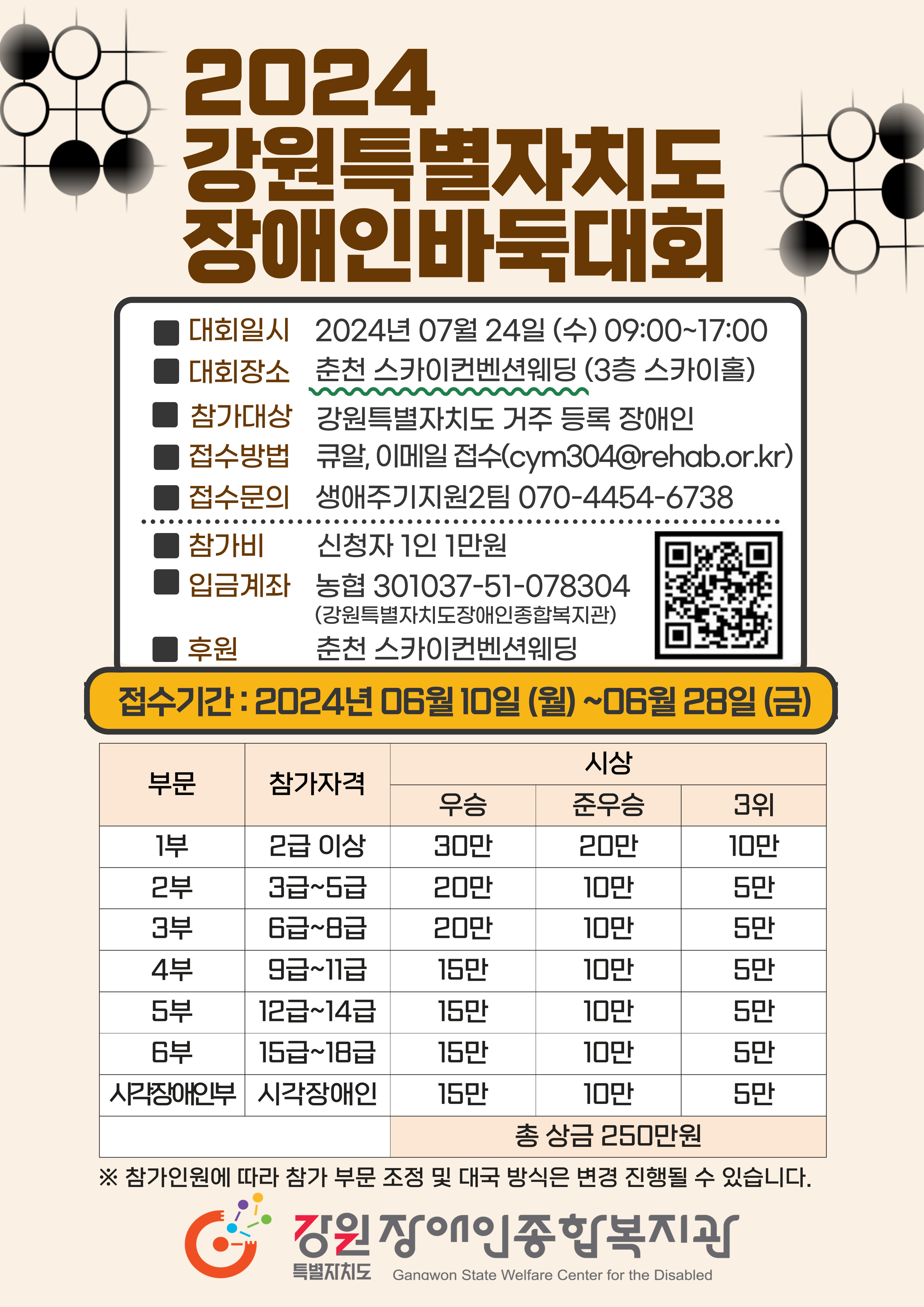 2024년 7월 24일 수요일 춘천 스카이컨벤션웨딩홀에서 강원특별자치도장애인바둑대회를 진행합니다.