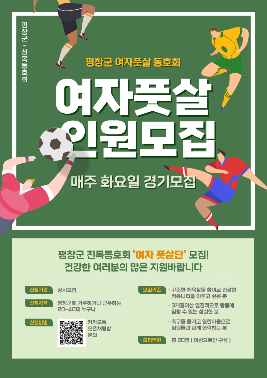 - 신청방법 : - 카카오톡 오픈채팅 " 평창군 여자풋살 모집" 검색 후 입장 or 첨부된 포스터에 QR코드를 통하시면 됩니다!!