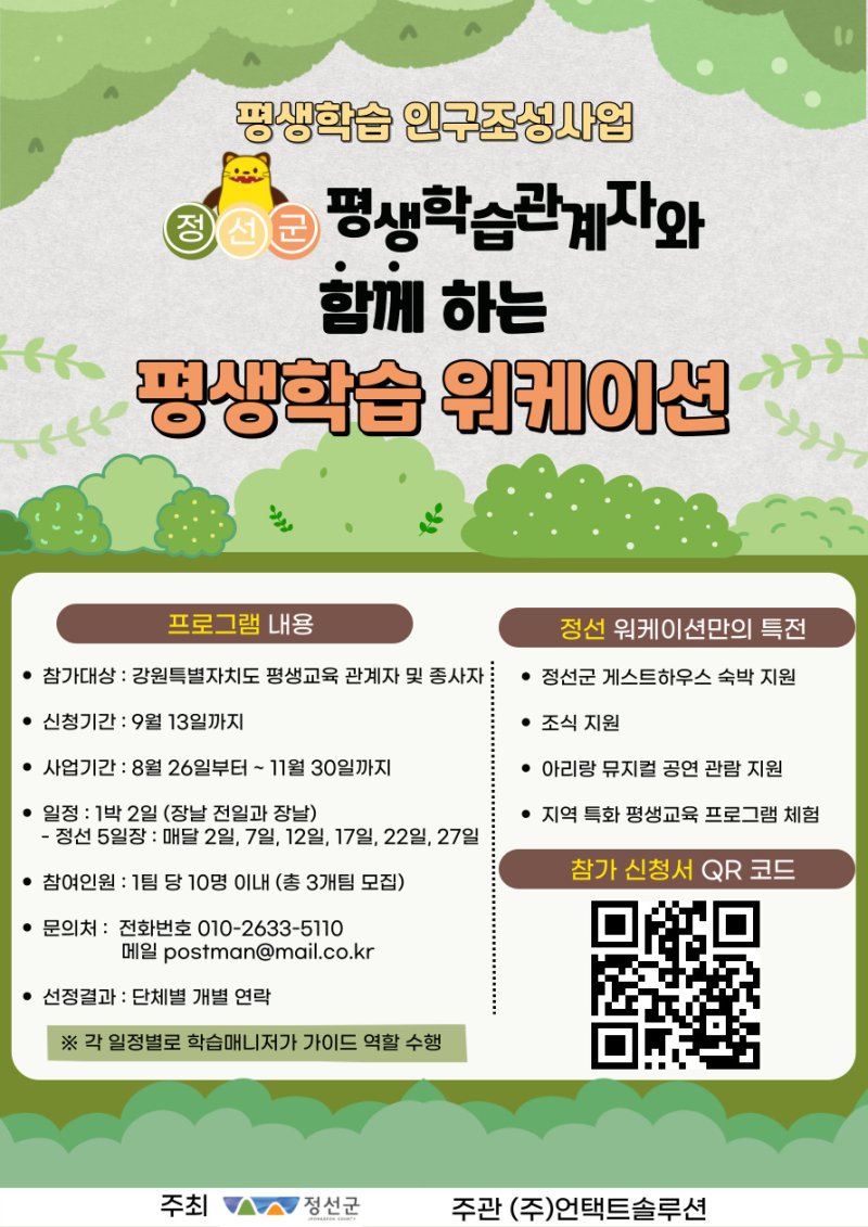 3. 지원내용 : 정선군평생학습관 견학, 정선군 특화 평생교육 프로그램 체험, 아리랑 뮤지컬 관람, 정선군 게스트하우스 숙박 지원, 조식 지원