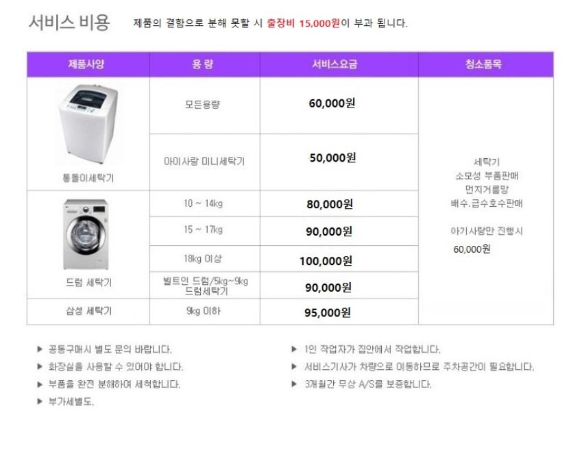 안녕하세요.홈케어전문업체 아라리홈그린입니다.세탁기청소, 에어컨청소, 보일러배관청소, 매트리스청소 등 가전제품 청소를 전문으로 하고 있습니다.전화 주시면 친절하게 안내드리겠습니다.네이버에서 "아라리홈그린"을 검색하시면 가격 및 서비스를 안내 받으실 수 있습니다.3품목 이상 의뢰시 할인대표번호 1811-1693기사번호 010-8783-5246