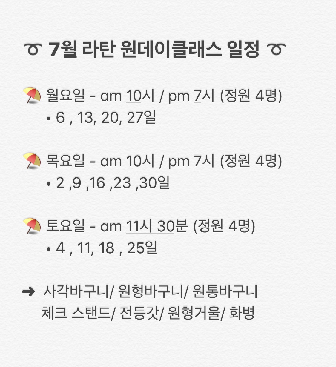 * 7월 라탄 원데이클래스 일정 *