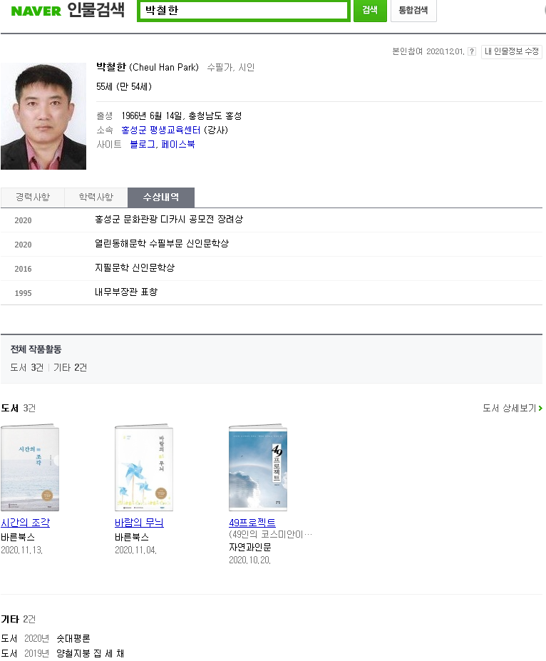 본인의 모지인 지필문학에 2016년도 시인으로 등단하였다. 그러나 운문(시) 창작 시인으로 정체함를 거부하며, 산문에도 깊은 관심을 갖고 지속적으로 습작을 하였다. 그리하여 2020년 3월 열린동해문학 수필가로 당당하게 등단한다. 그후 코스미안뉴스에 칼럼 투고 시도로 강건문화까지 이어져 두곳의 칼럼리스트로 활동 무대의 범위를 넓혔다. 이러한 노력으로 2020년 문화체육관광부와 장애인예술위에서 주관하는 '장애인문학창작활성화'사업에 선정됨의 영예를 얻게었다. 당초 사업계획을 설명하자면, 현재 전국의 10여 개소 문단의 필진으로 활동하고있다. 따라서 흩어진 발표작품과 인터넷 블로그와 페이스북에 공개한 습작들을 한권의 수필집으로 엮는 것이었다. 그리고 가족과 지인를 초대한 장소에서 1부 행사로 인문학 강연회 그리고 2부에 색소폰 연주회 및 조촐한 출판기념회 개최가 계획이었다. 그러나 작년 말 우한에서 발생한 코로나-19가 지구촌에 확산 전인류를 무차별 공격을 멈추지않는 실태이다. 따라서 대면 행사는 상당한 위험이 따르는 모험이자 고집임을 인지하였다. 또한 정부의 팽팽한 긴장한 상태에서 강도높은 방역정책 시행에 동참하는 의미에서 사업변경의 필요성을 인식하게되었다. 하여 비대면 행사의 일환인 시집추가 편찬 으로 계획 변경의 승인에 따라 같은 달에 시집과 수필집을 바른북스 출판사에서 동시 출간의 계기가 되었다. ?출간한 수필집(시간의 조각)은 어린 유년에서 현재까지의 삶에서 얻은 갈등과 상처의 고통과 그를 극복하는 사실적 체험의 67가지 이야기들을 1인칭 화법으로 진솔하게 이야기하고있다. 또한, 일독하다보면 작가는 현재의 이웃의 생활 바른 것인가? 아니면 자신이 사회을 모르는 순진함인가를 묻는 듯한 느낌을 받는다. 현재 '예스 24, 인터넷 교보문고, 알라딘, 인터파크 도서, 반디안주니스 온나인 서점에서 만날 수 있다. 첫 경험의 미숙함도 많겠으나, 넓은 아량의 이해와 크신 홍보의 일독을 기대한다.