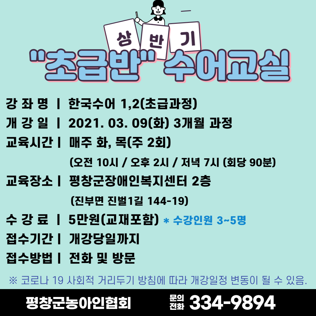 4. 교육장소: 평창군장애인복지센터 2층 농아인협회(평창군 진부면 진벌1길 144-19)5. 교육문의: 033-334-9894