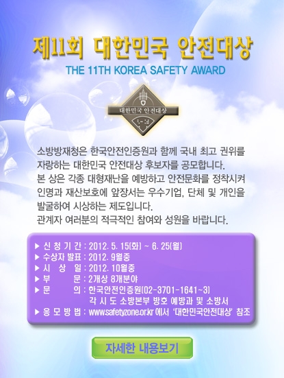 제11회 "대한민국안전대상" 시행요강을 첨부와 같이 안내하오니 참고하시기 바랍니다.