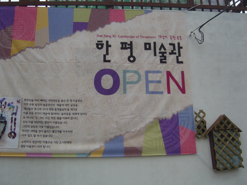 대상리의 마을회관 외관과 정자 2층 전시관에 세상에서 가장 작은 미술관 "한평미술관"이 개관했다.