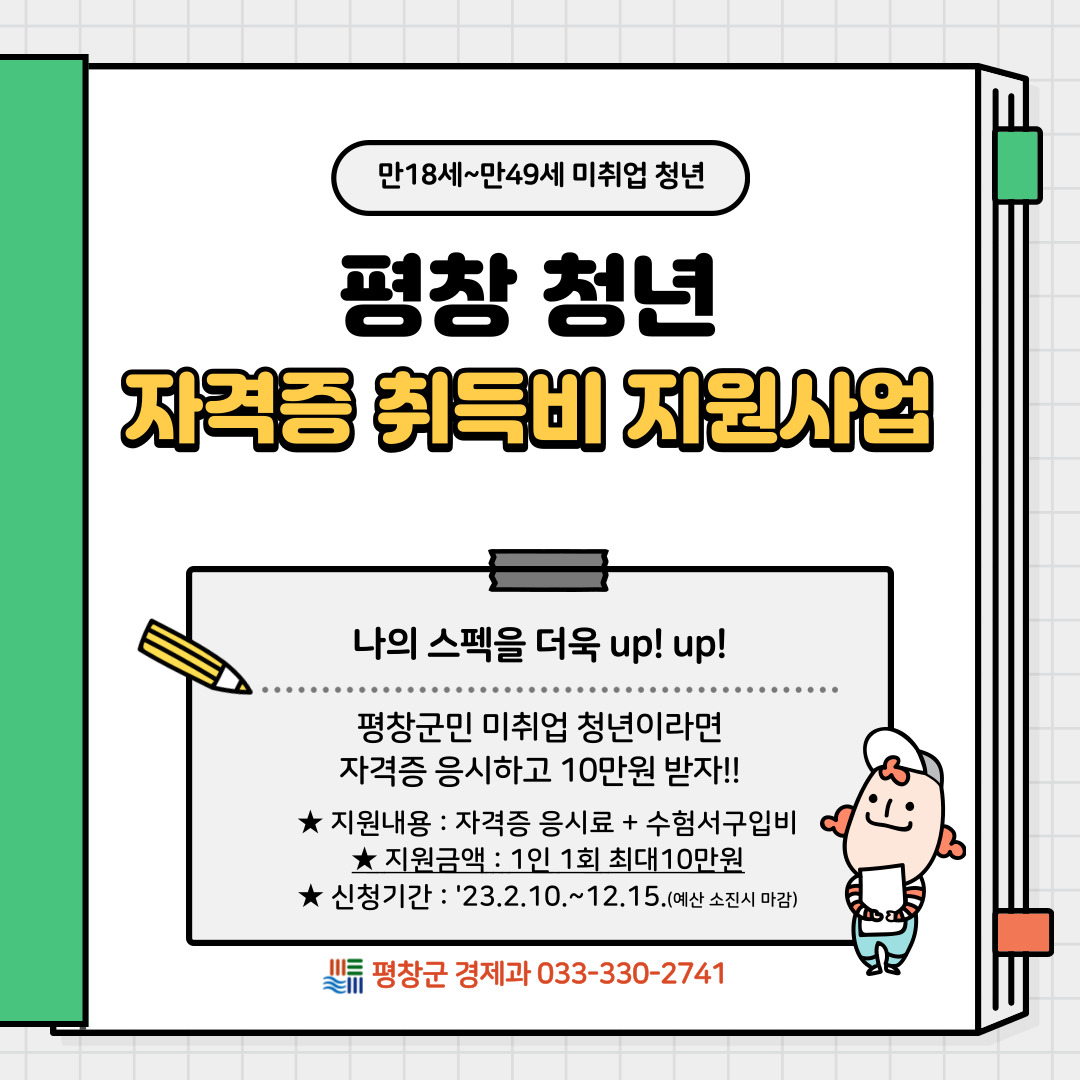 평창군은 미취업 청년의 능력과 적성에 맞는 취업 및 창업을 준비하도록 기회를 제공하고자 2023년도 청년자격증 취득비 지원사업의 대상자를 다음과 같이 모집하오니 많은 신청 바랍니다.