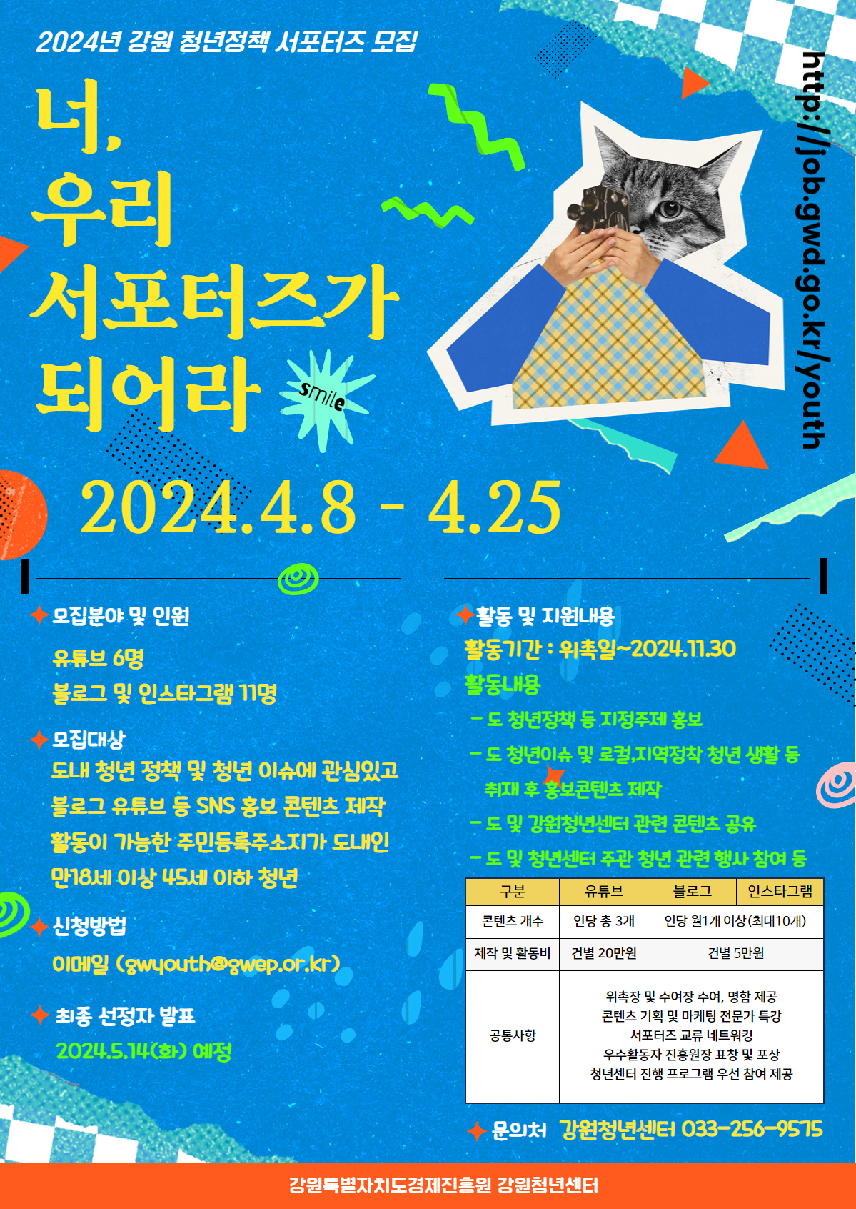 강원 청년센터에서는 강원 청년정책의 청년 체감도를 제고하기 위해 유튜브 및 인스타그램 등을 활용한 강원 청년정책 서포터즈를 아래와 같이 모집하고 있습니다.