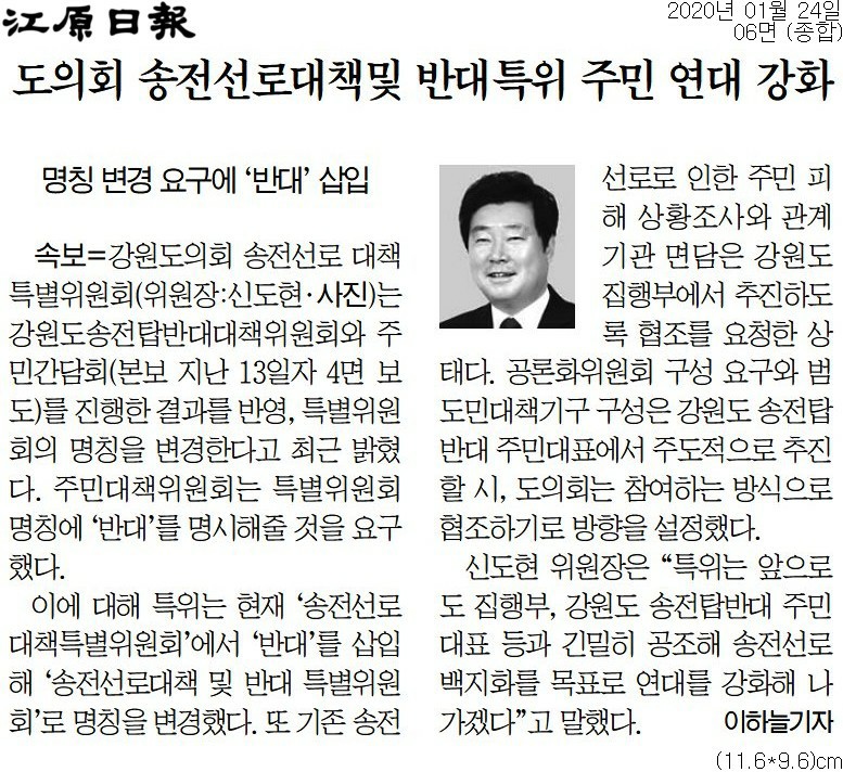 코로나19에도 한전은 철탑추진에 혈안이 되어 거짖 속임수로 주민간 갈등과 불화를 조장하고 있다.. 아직 노선확정 동의도 안했는데 철탑위치에 말뚝을 박는다고 협박사진을 보내고있다. 동부구간 입지선정위 결정만으로 마을별 합의는 위법이며 더욱 선로확정이 안된 상태이고 서부구간은 7차진행중이니 동서부구간 확정전 마을별 보상협의는 소용이 없다. 가구별 현금지원해주는 것으로 잘못 아는 일부 마을의 협의는 효력이 없다. 속는 것이다. 만일 철탑이 들어온다면 법으로 6년간 사업신청서를 내서 사업비 검토후 마을 공동사업에 쓰는 것이지 현금으로 받는 거시 아님을 모르는 주민들이 대다수이다. 특별지원사업비도 사업계획서 검토후 확정되면 마을공동사업자금으로, 개인통장에 입금해줄 수 없다.지동리마을은 전주민이 일치단결하여 한전의 농락당하지 않기로 결의하였음을 알린다. 평창군 반투위 간사 송향섭 전화 010 삼삼이이 팔일일오