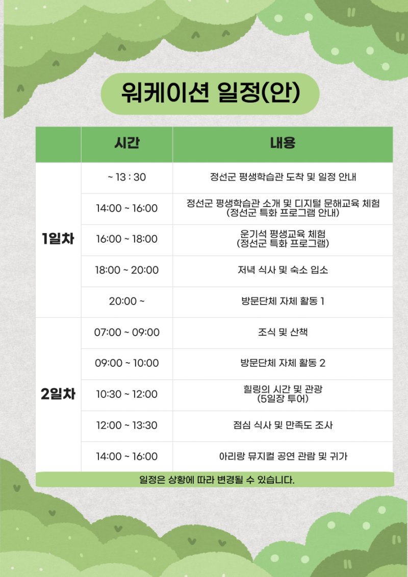 3. 지원내용 : 정선군평생학습관 견학, 정선군 특화 평생교육 프로그램 체험, 아리랑 뮤지컬 관람, 정선군 게스트하우스 숙박 지원, 조식 지원