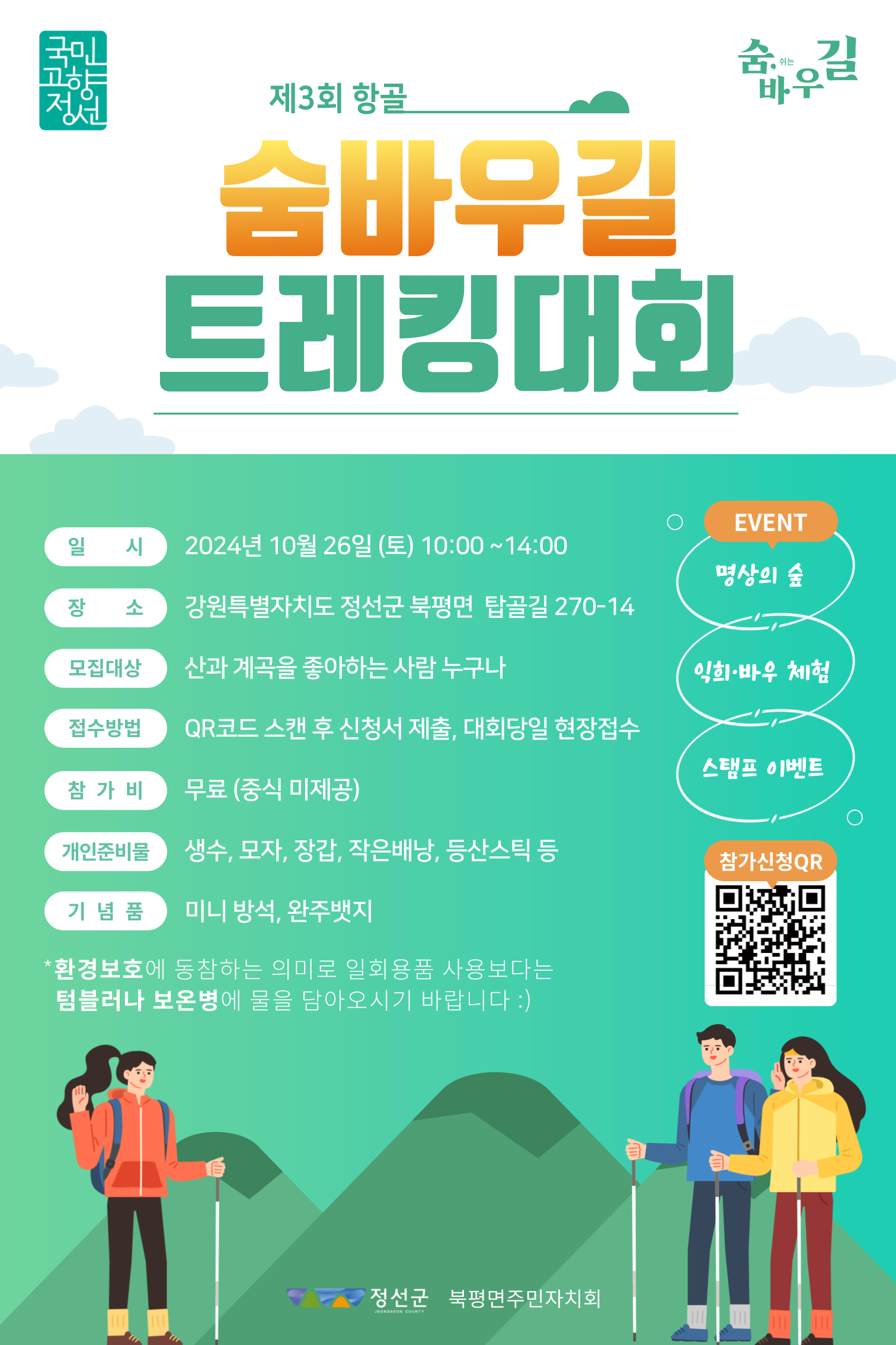 친구나 가족과 함께 멋진 자연 속에서 건강과 즐거움을 모두 챙길 수 있는 이번 트레킹 대회에 많은 참여 바랍니다!