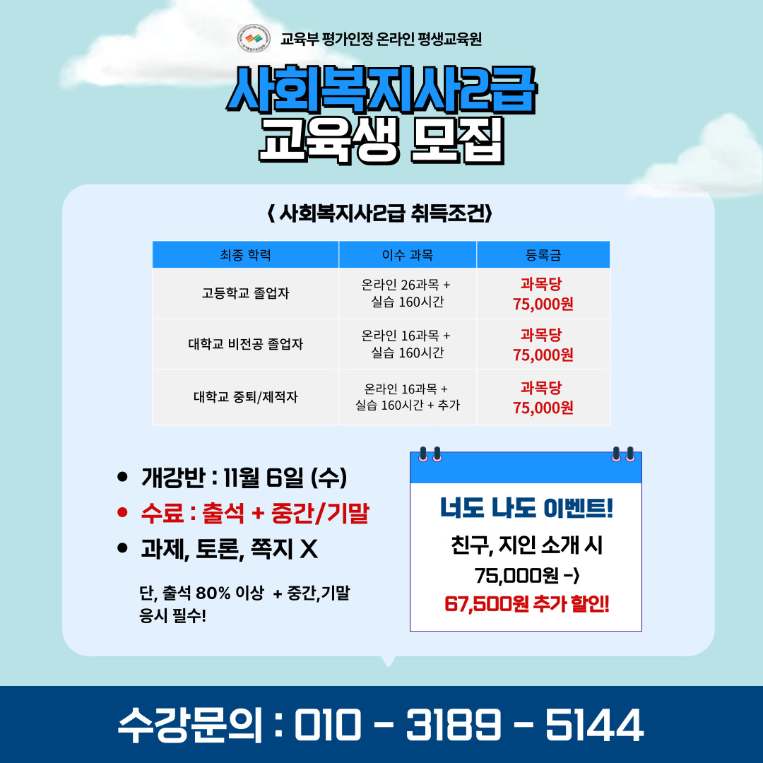㉠ 온라인 과목 : 75,000원 (기존 50%할인 + 지인 동반 시 5% 추가 할인)