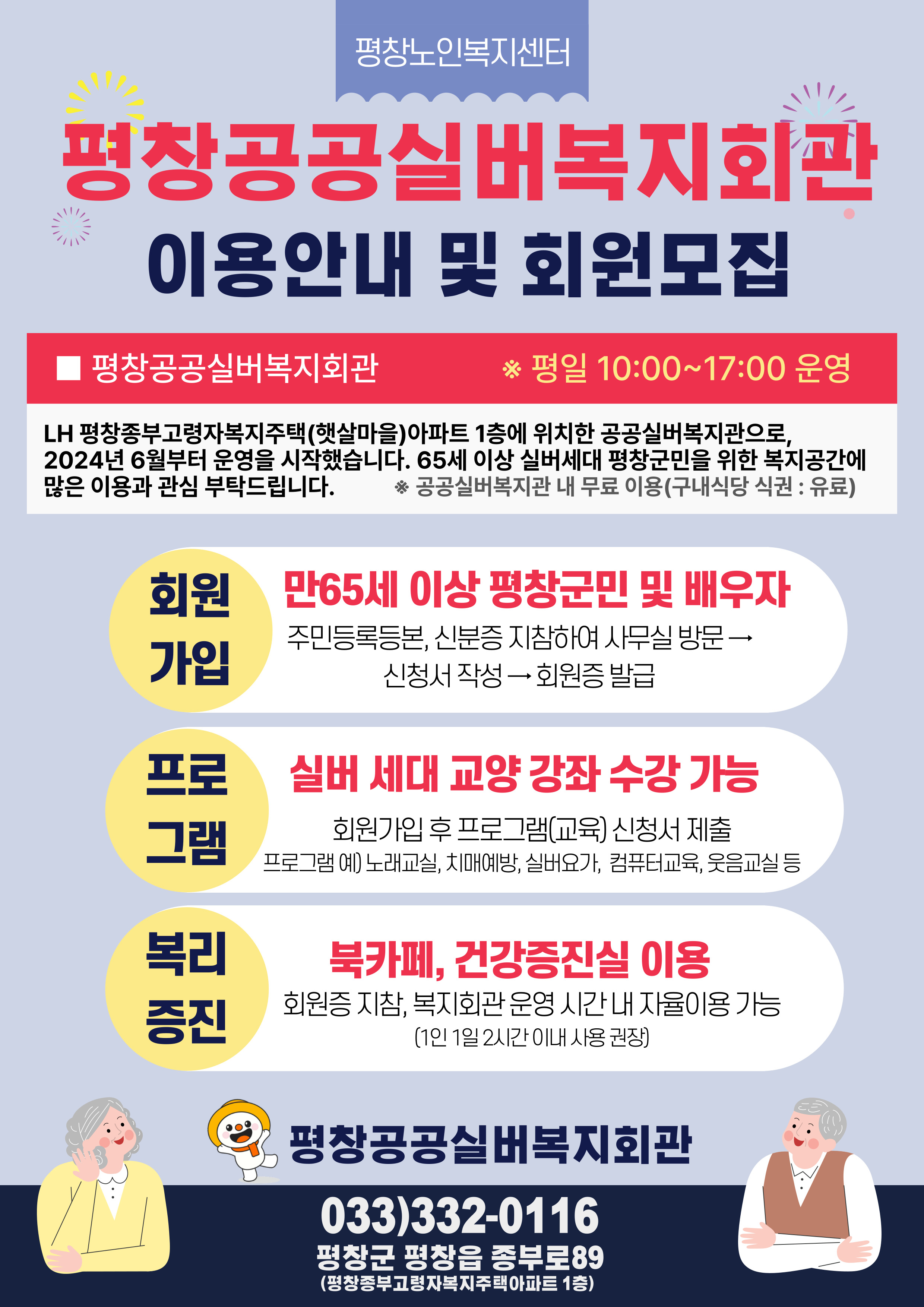 - 주소: 평창군 평창읍 종부로89 평창종부고령자복지주택(햇살마을)아파트 1층 실버복지관