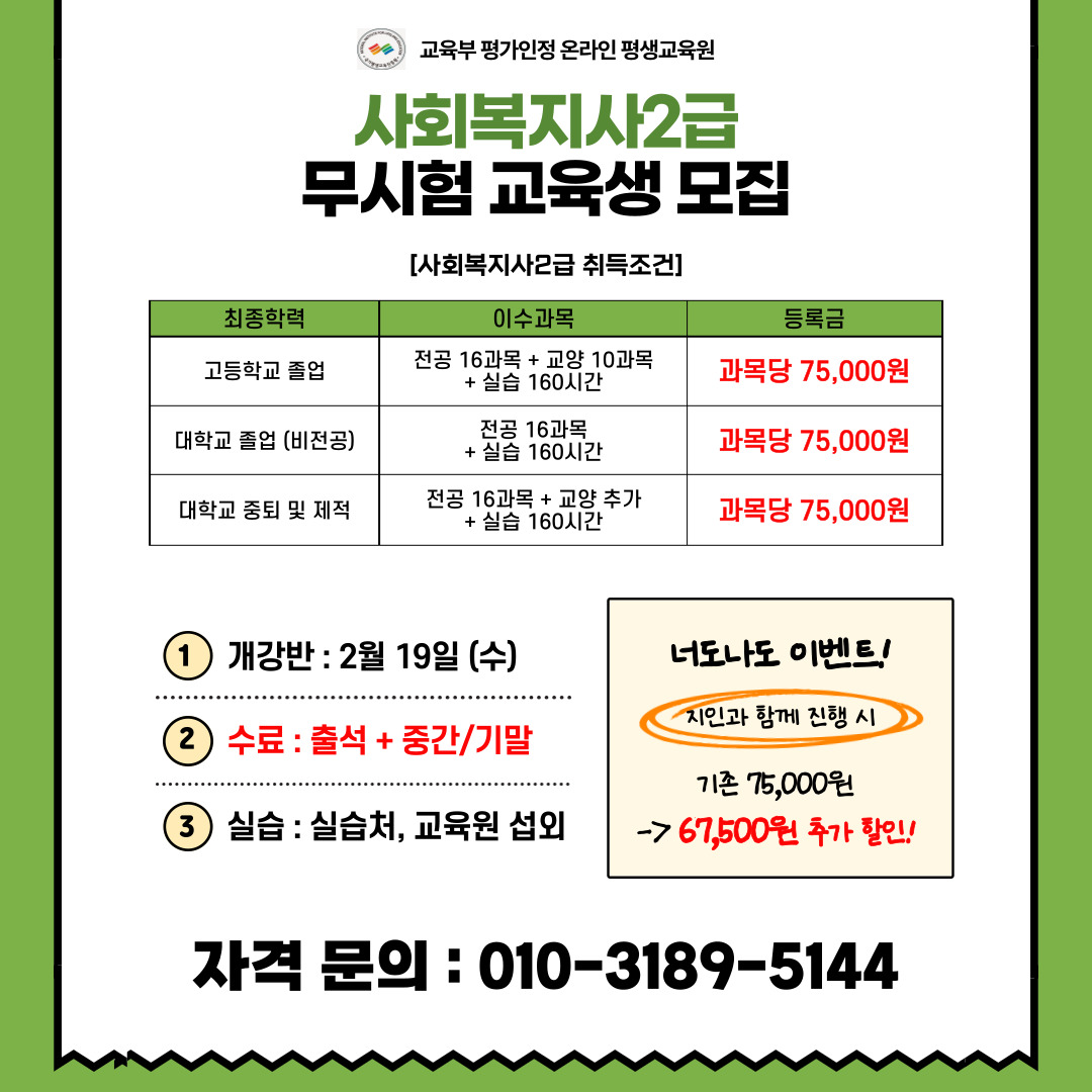 ㉠ 온라인 과목 : 75,000원 (지인 동반 시 5% 추가 할인)