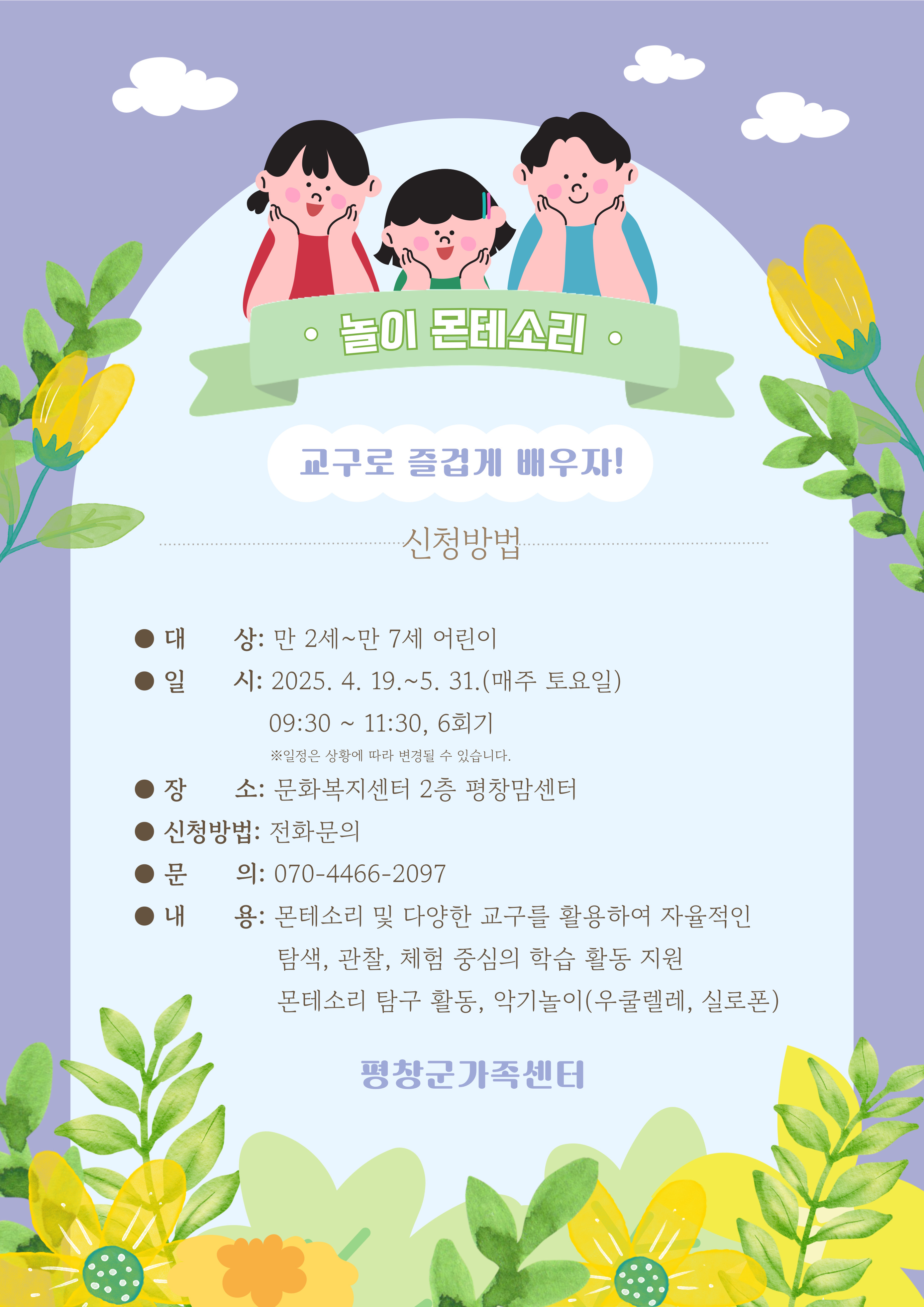 [평창군가족센터] 놀이 몬테소리 대상자 모집합니다.