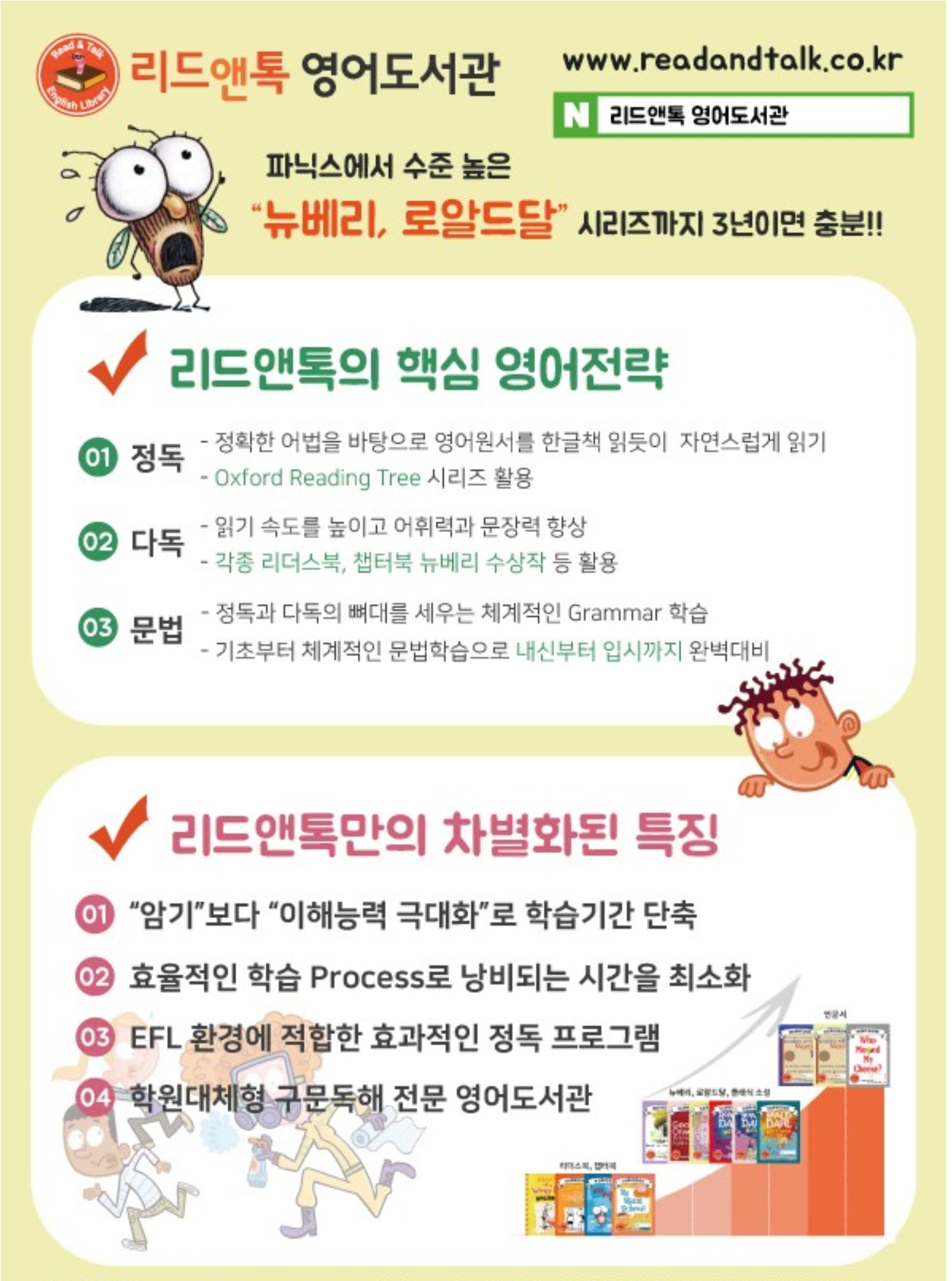리드앤톡 영어도서관은 초중고 학생들을 대상으로 영어원서로 영어수업을 하는 학원이에요. 어떤 어학원보다 아이들의 실력 향상이 빠른 곳이기에 서울 경기지역을 중심으로 전국에 300여 센터가 있습니다.