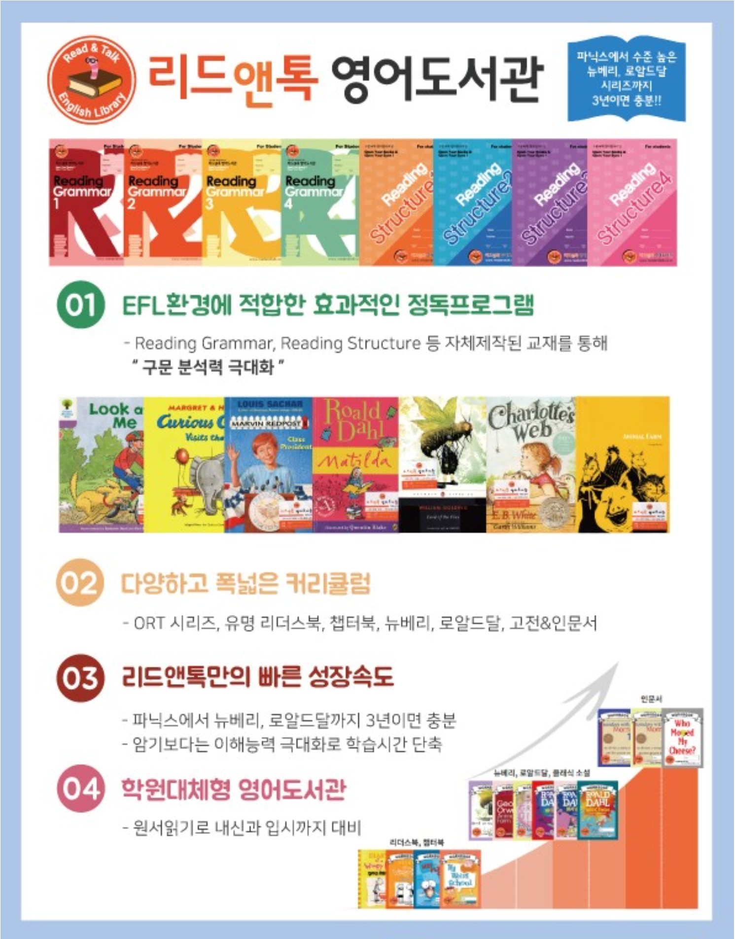 리드앤톡에서 정독과 다독을 꾸준히 해온 대다수의 아이들이 3년 내에 쉬운 뉴베리 수상작, 로달드 달 수준의 원서를 읽어요. 물론 수능형 모의고사도 풀 수 있지요. 영어문장의 체계를 제대로 배우기 때문에 중,고등학교에 가서 내신을 위한 문법을 따로 연습할 필요가 없어요.